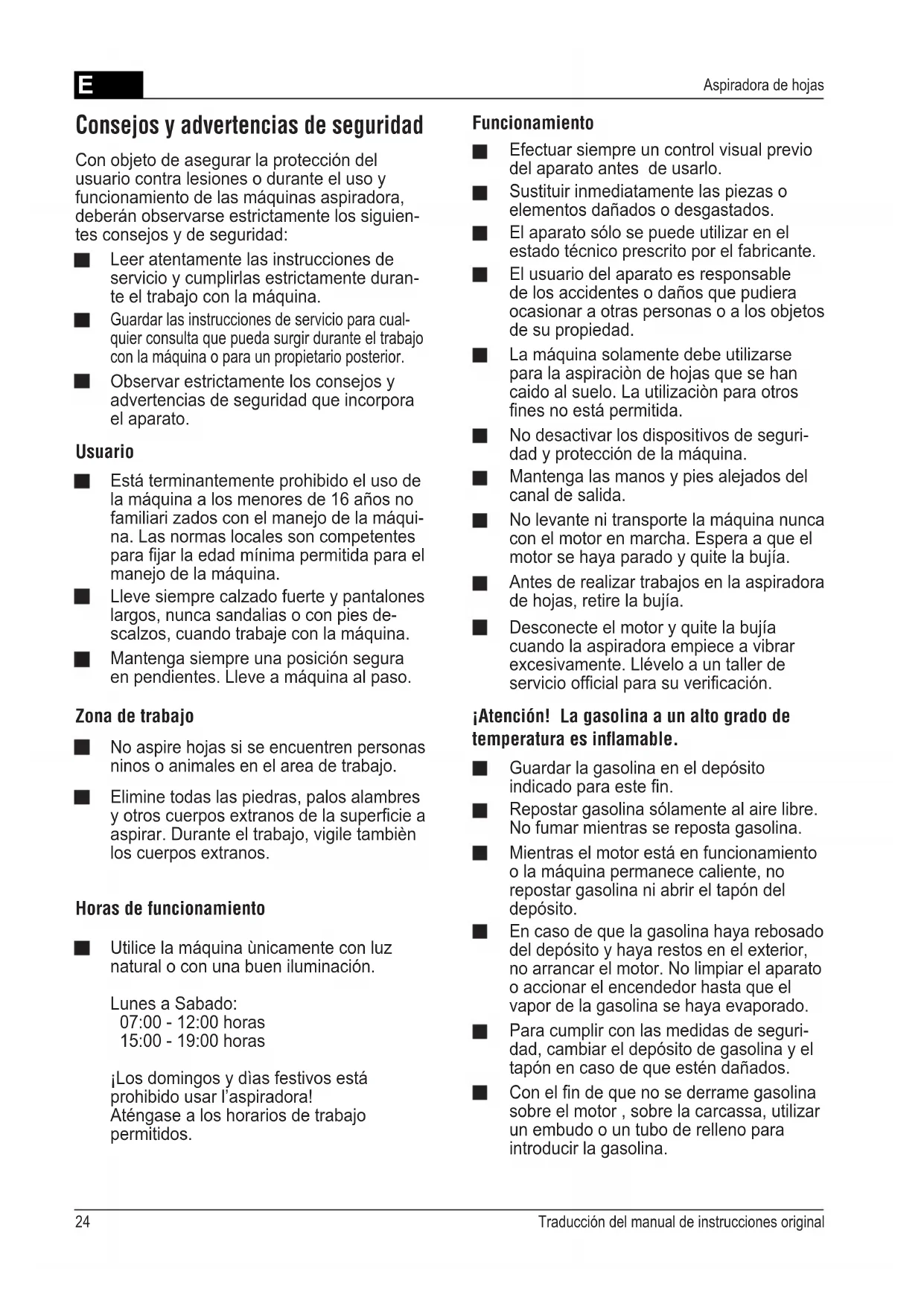Aspiradora de hojas Con objeto de asegurar la protección del usuario contra lesiones o durante el uso y funcionamiento de las máquinas aspiradora, deberán observarse estrictamente los siguien- tes consejos y de seguridad: Consejos y advertencias de seguridad Leer atentamente las instrucciones de servicio y cumplirlas estrictamente duran- te el trabajo con la máquina. Guardar las instrucciones de servicio para cual- quier consulta que pueda surgir durante el trabajo con la máquina o para un propietario posterior. Observar estrictamente los consejos y advertencias de seguridad que incorpora el aparato. Usuario Está terminantemente prohibido el uso de la máquina a los menores de 16 años no familiari zados con el manejo de la máqui- na. Las normas locales son competentes para jar la edad mínima permitida para el manejo de la máquina. Lleve siempre calzado fuerte y pantalones largos, nunca sandalias o con pies de- scalzos, cuando trabaje con la máquina. Zona de trabajo No aspire hojas si se encuentren personas ninos o animales en el area de trabajo. Elimine todas las piedras, palos alambres y otros cuerpos extranos de la supercie a aspirar. Durante el trabajo, vigile tambièn los cuerpos extranos. Horas de funcionamiento Utilice la máquina ùnicamente con luz natural o con una buen iluminación. Lunes a Sabado: 07:00 - 12:00 horas 15:00 - 19:00 horas ¡Los domingos y dìas festivos está prohibido usar l’aspiradora! Aténgase a los horarios de trabajo permitidos. Mantenga siempre una posición segura en pendientes. Lleve a máquina al paso. Funcionamiento Efectuar siempre un control visual previo del aparato antes de usarlo. Sustituir inmediatamente las piezas o elementos dañados o desgastados. El aparato sólo se puede utilizar en el estado técnico prescrito por el fabricante. El usuario del aparato es responsable de los accidentes o daños que pudiera ocasionar a otras personas o a los objetos de su propiedad. La máquina solamente debe utilizarse para la aspiraciòn de hojas que se han caido al suelo. La utilizaciòn para otros nes no está permitida. No desactivar los dispositivos de seguri- dad y protección de la máquina. Mantenga las manos y pies alejados del canal de salida. No levante ni transporte la máquina nunca con el motor en marcha. Espera a que el motor se haya parado y quite la bujía. Antes de realizar trabajos en la aspiradora de hojas, retire la bujía. Desconecte el motor y quite la bujía cuando la aspiradora empiece a vibrar excesivamente. Llévelo a un taller de servicio ofcial para su vericación. ¡Atención! La gasolina a un alto grado de temperatura es inflamable. Guardar la gasolina en el depósito indicado para este n. Repostar gasolina sólamente al aire libre. No fumar mientras se reposta gasolina. Mientras el motor está en funcionamiento o la máquina permanece caliente, no repostar gasolina ni abrir el tapón del depósito. En caso de que la gasolina haya rebosado del depósito y haya restos en el exterior, no arrancar el motor. No limpiar el aparato o accionar el encendedor hasta que el vapor de la gasolina se haya evaporado. Para cumplir con las medidas de seguri- dad, cambiar el depósito de gasolina y el tapón en caso de que estén dañados. Con el n de que no se derrame gasolina sobre el motor , sobre la carcassa, utilizar un embudo o un tubo de relleno para introducir la gasolina.E 25528123_f ¡Peligro de quemaduras! El tubo de escape y las zonas más cercanas pueden llegar a alcanzar los 80°C de temperatura. Cambiar los si- lenciadores en caso de quen estén dañados. No modicar los valores del regulador del motor. No dejar en funcionamiento el motor de combustión en lugares cerrados - ¡Peligro de asxia! Repuestos y accesorios Tan sólo se utilizarán repuestos y acceso- rios originales del fabricante. Nos reservamos el derecho de introdu- cir modicaciones constructivas y de ejecución. En las presentes instrucciones de uso ¡Peligro! El incumplimiento de esta adver- tencia puede provocar lesiones en el usuario de la máquina. Montaje Para efectuar el montaje del aparato deberán observerse estrictamente las instrucciones de montaje suministradas con el aparato. Dispositivos de seguridad Palanca de seguridad Soltar la palanca de seguridad en caso de peligro: El motor y la impeledor se paran. ¡No anular en ningùn caso la función de la palanca de seguridad! Simbolos en el aparato ¡Lea las instrucciones de manejo! ¡Mantenga alejadas a las personas presentes! Antes de realizar trabajos en la aspiradora de hojas, retire la bujía. ¡Attención peligro! Mantenga las manos y pies alejados del canal de salida. La cifra situada en el lado izquierdo del texto se reere al número del dibujo, por ejemplo: Consejos para preservar el medio am- biente / Eliminación del embalaje ¡No elimine las máquinas fuera de uso con los residuos domésticos! Los embalajes, la máquina y los accesorios están fabricados con materiales reciclabes y deben desecharse adecuadamente. Puesta en marcha Poner el aparato en marcha sólo una vez que se ha completado el montaje de todas sus piezas y elementos.