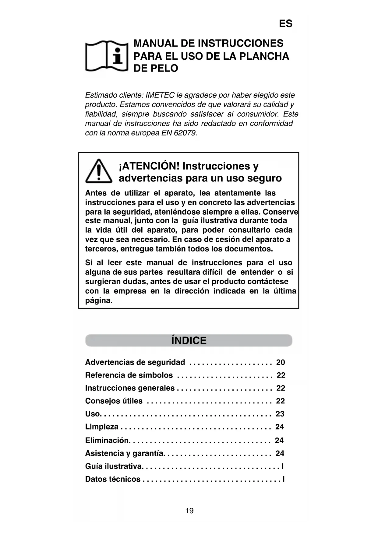 MANUAL DE INSTRUCCIONES PARA EL USO DE LA PLANCHA DE PELO Estimado cliente: IMETEC le agradece por haber elegido este