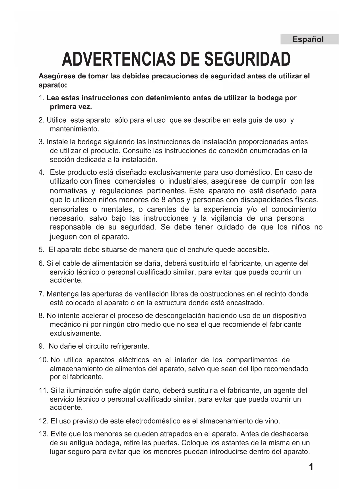 1. Lea estas instrucciones con detenimiento antes de utilizar la bodega por