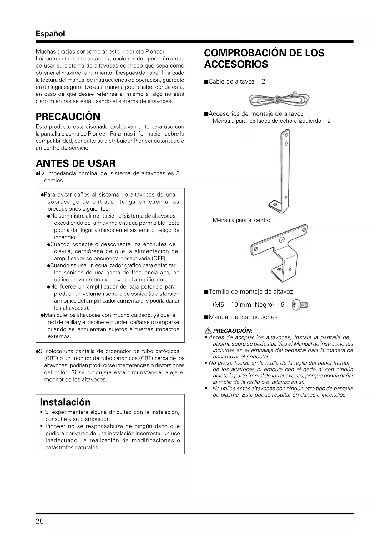 28 Muchas gracias por comprar este producto Pioneer.Lea completamente estas instrucciones de operación antesde usar su sistema de altavoces de modo que sepa cómoobtener el máximo rendimiento. Después de haber finalizadola lectura del manual de instrucciones de operación, guárdeloen un lugar seguro. De esta manera podrá saber dónde está,en caso de que desee referirse al mismo si algo no estáclaro mientras se está usando el sistema de altavoces. PRECAUCIÓN Este producto está diseñado exclusivamente para uso conla pantalla plasma de Pioneer. Para más información sobre lacompatibilidad, consulte su distribuidor Pioneer autorizado oun centro de servicio. ANTES DE USAR ÷ La impedancia nominal del sistema de altavoces es 8ohmios.÷ Para evitar daños al sistema de altavoces de unasobrecarga de entrada, tenga en cuenta lasprecauciones siguientes:÷ No suministre alimentación al sistema de altavocesexcediendo de la máxima entrada permisible. Estopodría dar lugar a daños en el sistema o riesgo deincendio.÷ Cuando conecte o desconecte los enchufes declavija, cerciórese de que la alimentación delamplificador se encuentra desactivada (OFF).÷ Cuando se usa un ecualizador gráfico para enfatizarlos sonidos de una gama de frecuencia alta, noutilice un volumen excesivo del amplificador.÷ No fuerce un amplificador de baja potencia paraproducir un volumen sonoro de sonido (la distorsiónarmónica del amplificador aumentará, y podría dañarlos altavoces).÷ Manipule los altavoces con mucho cuidado, ya que lared de rejilla y el gabinete pueden dañarse o rompersecuando se encuentran sujetos a fuertes impactosexternos.÷ Si coloca una pantalla de ordenador de tubo catódicos(CRT) o un monitor de tubo catódicos (CRT) cerca de losaltavoces, podrían producirse interferencias o distorsionesdel color. Si se produjera esta circunstancia, aleje elmonitor de los altavoces. Instalación • Si experimentara alguna dificultad con la instalación,consulte a su distribuidor.• Pioneer no se responsabiliza de ningún daño quepudiera derivarse de una instalación incorrecta, un usoinadecuado, la realización de modificaciones ocatástrofes naturales.