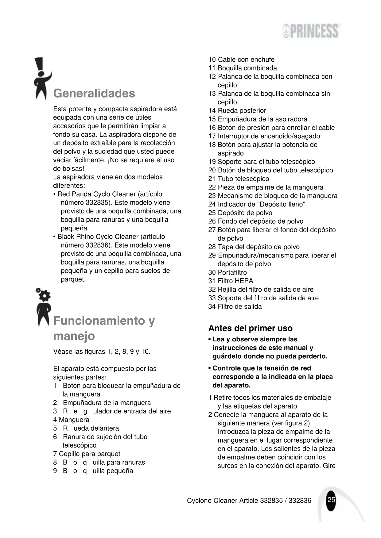 - Black Rhino Cyclo Cleaner (artículo número 332836). Este modelo viene provisto de una boquilla combinada, una boquilla para ranuras, una boquilla pequeña y un cepillo para suelos de parquet. Funcionamiento y manejo Véase las figuras 1, 2, 8, 9 y 10. El aparato está compuesto por las siguientes partes: 1 Botón para bloquear la empuñadura de la manguera 2Empuñadura de la manguera 3Regulador de entrada del aire 4 Manguera 5Rueda delantera 6Ranura de sujeción del tubo telescópico 7 Cepillo para parquet 8Boquilla para ranuras 9Boquilla pequeña 10 Cable con enchufe 11 Boquilla combinada 12 Palanca de la boqu illa combinada con cepillo 13 Palanca de la boqu illa combinada sin cepillo 14 Rueda posterior 15 Empuñadura de la aspiradora 16 Botón de presión para enrollar el cable 17 Interruptor de encendido/apagado 18 Botón para ajustar la potencia de aspirado 19 Soporte para el tubo telescópico 20 Botón de bloqueo del tubo telescópico 21 Tubo telescópico 22 Pieza de empalme de la mangu era 23 Mecanismo de bloqueo de la manguera 24 Indicador de "Depósito lleno" 25 Depósito de polvo 26 Fondo del depósito de polvo 27 Botón para liberar el fondo del depósito de polvo 28 Tapa del depósito de polvo 29 Empuñadura/mecanismo para liberar el depósito de polvo 30 Portafiltro 31 Filtro HEPA 32 Rejilla del filtro de salida de aire 33 Soporte del filtro de salida de aire 34 Filtro de salida Antes del primer uso