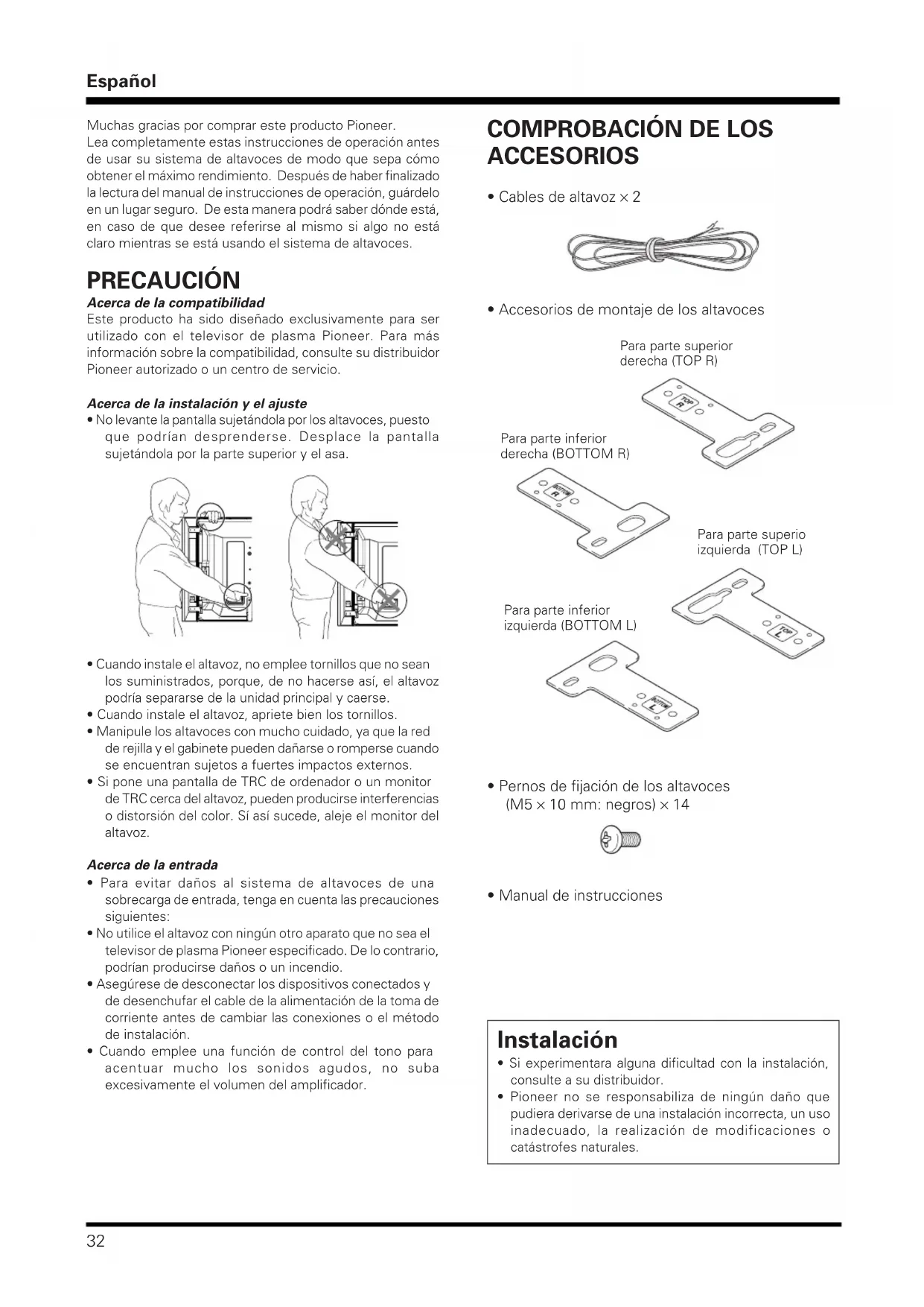 PRECAUCIÓN Acerca de la compatibilidad Este producto ha sido diseñado exclusivamente para serutilizado con el televisor de plasma Pioneer. Para másinformación sobre la compatibilidad, consulte su distribuidorPioneer autorizado o un centro de servicio. Acerca de la instalación y el ajuste • No levante la pantalla sujetándola por los altavoces, puestoque podrían desprenderse. Desplace la pantallasujetándola por la parte superior y el asa.