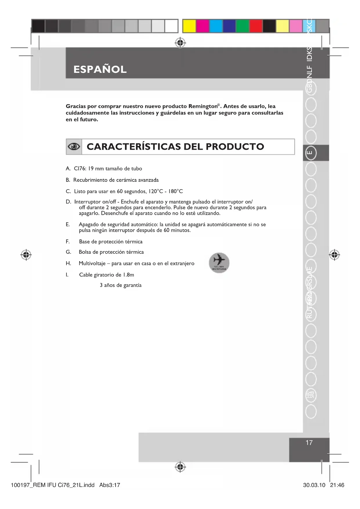 SRB E Gracias por comprar nuestro nuevo producto Remington ® . Antes de usarlo, lea cuidadosamente las instrucciones y guárdelas en un lugar seguro para consultarlas en el futuro. CARACTERÍSTICAS DEL PRODUCTO A. CI76: 19 mm tamaño de tuboB. Recubrimiento de cerámica avanzadaC. Listo para usar en 60 segundos, 120°C - 180°C D. Interruptor on/off - Enchufe el aparato y mantenga pulsado el interruptor on/off durante 2 segundos para encenderlo. Pulse de nuevo durante 2 segundos para apagarlo. Desenchufe el aparato cuando no lo esté utilizando.E. Apagado de seguridad automático: la unidad se apagará automáticamente si no se pulsa ningún interruptor después de 60 minutos.F. Base de protección térmicaG. Bolsa de protección térmicaH. Multivoltaje – para usar en casa o en el extranjeroI. Cable giratorio de 1.8m
