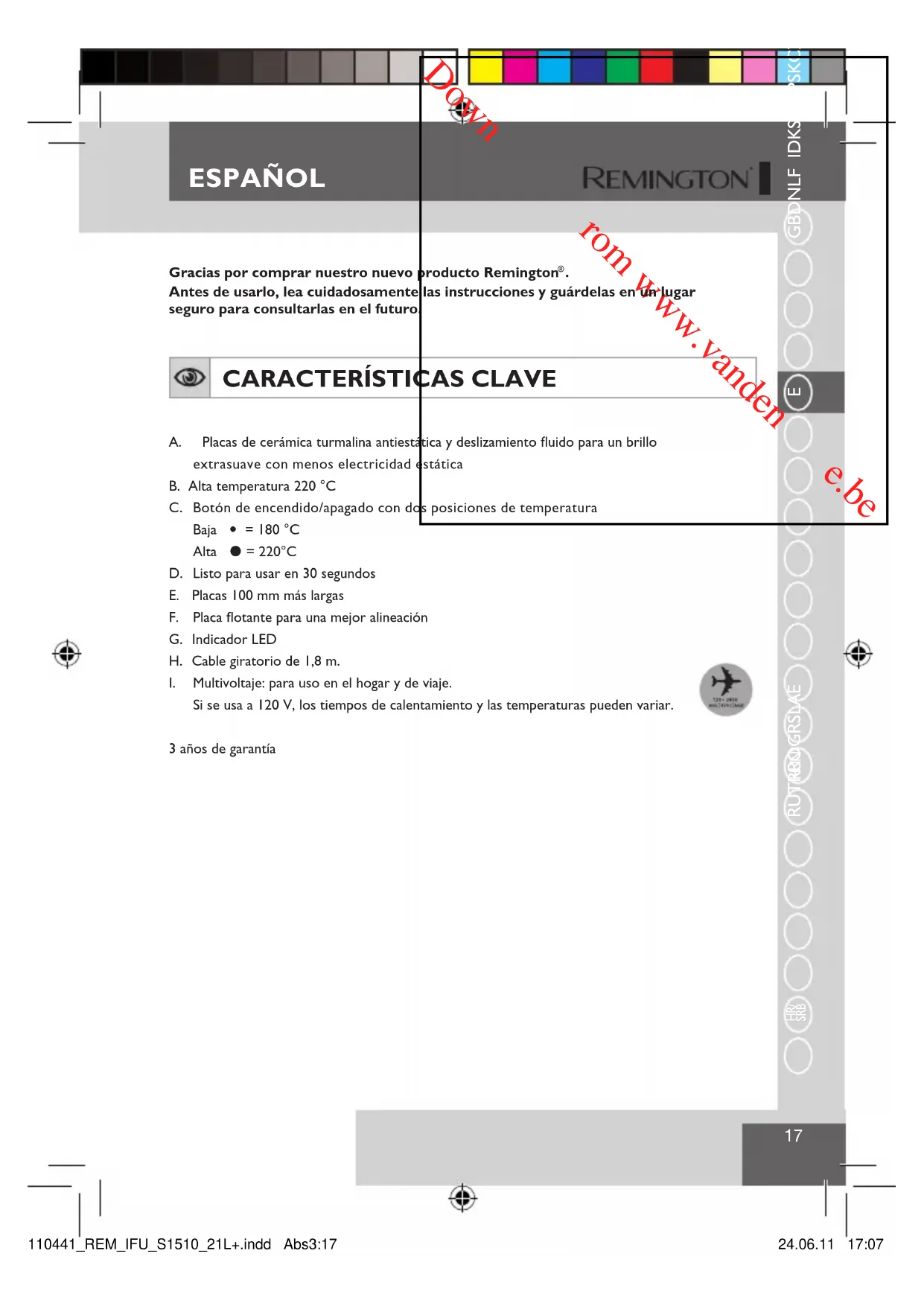 . Antes de usarlo, lea cuidadosamente las instrucciones y guárdelas en un lugar seguro para consultarlas en el futuro. CARACTERÍSTICAS CLAVE A. Placas de cerámica turmalina antiestática y deslizamiento fluido para un brillo extrasuave con menos electricidad estáticaB. Alta temperatura 220 °CC. Botón de encendido/apagado con dos posiciones de temperatura Baja = 180 °C Alta = 220°CD. Listo para usar en 30 segundosE. Placas 100 mm más largasF. Placa flotante para una mejor alineaciónG. Indicador LEDH. Cable giratorio de 1,8 m.I. Multivoltaje: para uso en el hogar y de viaje.Si se usa a 120 V, los tiempos de calentamiento y las temperaturas pueden variar.3 años de garantía110441_REM_IFU_S1510_21L+.indd Abs3:17 24.06.11 17:07Downloaded from www.vandenborre.be