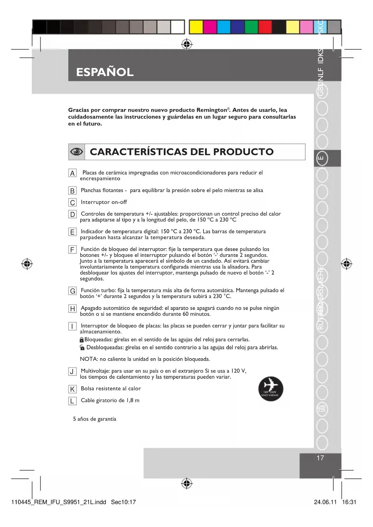 CARACTERÍSTICAS DEL PRODUCTO A Placas de cerámica impregnadas con microacondicionadores para reducir el encrespamiento B Planchas flotantes - para equilibrar la presión sobre el pelo mientras se alisa C Interruptor on-off D Controles de temperatura +/- ajustables: proporcionan un control preciso del calor para adaptarse al tipo y a la longitud del pelo, de 150 ºC a 230 ºC E Indicador de temperatura digital: 150 ºC a 230 ºC. Las barras de temperatura parpadean hasta alcanzar la temperatura deseada. F Función de bloqueo del interruptor: fije la temperatura que desee pulsando los botones +/- y bloquee el interruptor pulsando el botón ‘-‘ durante 2 segundos. Junto a la temperatura aparecerá el símbolo de un candado. Así evitará cambiar involuntariamente la temperatura configurada mientras usa la alisadora. Para desbloquear los ajustes del interruptor, mantenga pulsado de nuevo el botón ‘-’ 2 segundos. G Función turbo: fija la temperatura más alta de forma automática. Mantenga pulsado el botón ‘+’ durante 2 segundos y la temperatura subirá a 230 °C. H Apagado automático de seguridad: el aparato se apagará cuando no se pulse ningún botón o si se mantiene encendido durante 60 minutos. I Interruptor de bloqueo de placas: las placas se pueden cerrar y juntar para facilitar su almacenamiento. Bloqueadas: gírelas en el sentido de las agujas del reloj para cerrarlas. Desbloqueadas: gírelas en el sentido contrario a las agujas del reloj para abrirlas.NOTA: no caliente la unidad en la posición bloqueada. J Multivoltaje: para usar en su país o en el extranjero Si se usa a 120 V, los tiempos de calentamiento y las temperaturas pueden variar. K Bolsa resistente al calor L Cable giratorio de 1,8 m 5 años de garantía ESPAÑOL 120 - 240V MULTI VOLTAGE 110445_REM_IFU_S9951_21L.indd Sec10:17 24.06.11 16:3118