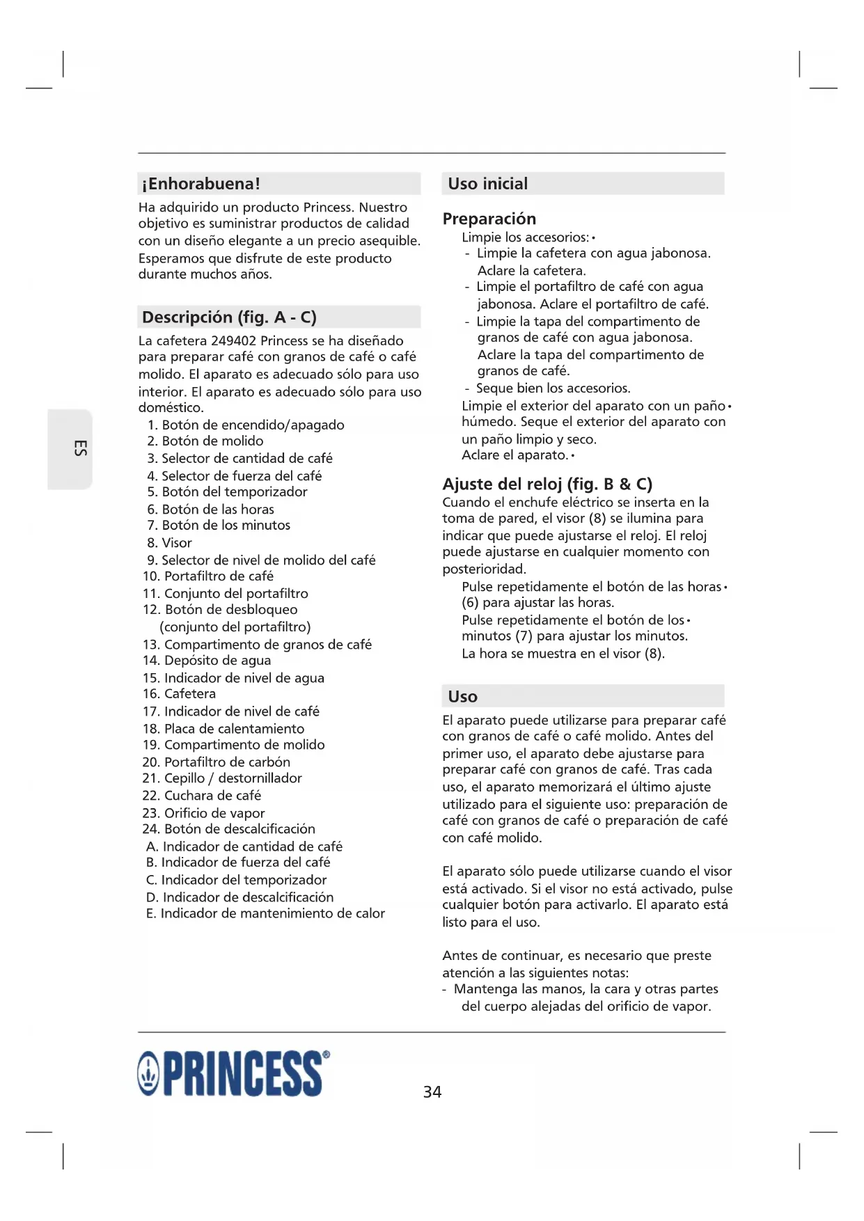 ¡Enhorabuena! Ha adquirido un producto Princess. Nuestro objetivo es suministrar productos de calidad con un diseño elegante a un precio asequible. Esperamos que disfrute de este producto durante muchos años. Descripción (fig. A - C) La cafetera 249402 Princess se ha diseñado para preparar café con granos de café o café molido. El aparato es adecuado sólo para uso interior. El aparato es adecuado sólo para uso doméstico.