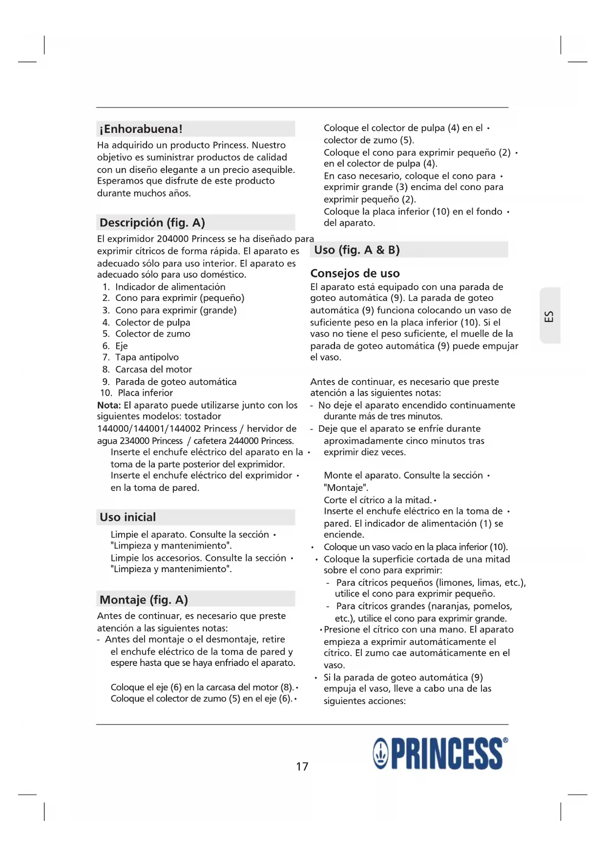 ¡Enhorabuena! Ha adquirido un producto Princess. Nuestro objetivo es suministrar productos de calidad con un diseño elegante a un precio asequible. Esperamos que disfrute de este producto durante muchos años. Descripción (fig. A) El exprimidor 204000 Princess se ha diseñado para exprimir cítricos de forma rápida. El aparato es adecuado sólo para uso interior. El aparato es adecuado sólo para uso doméstico.
