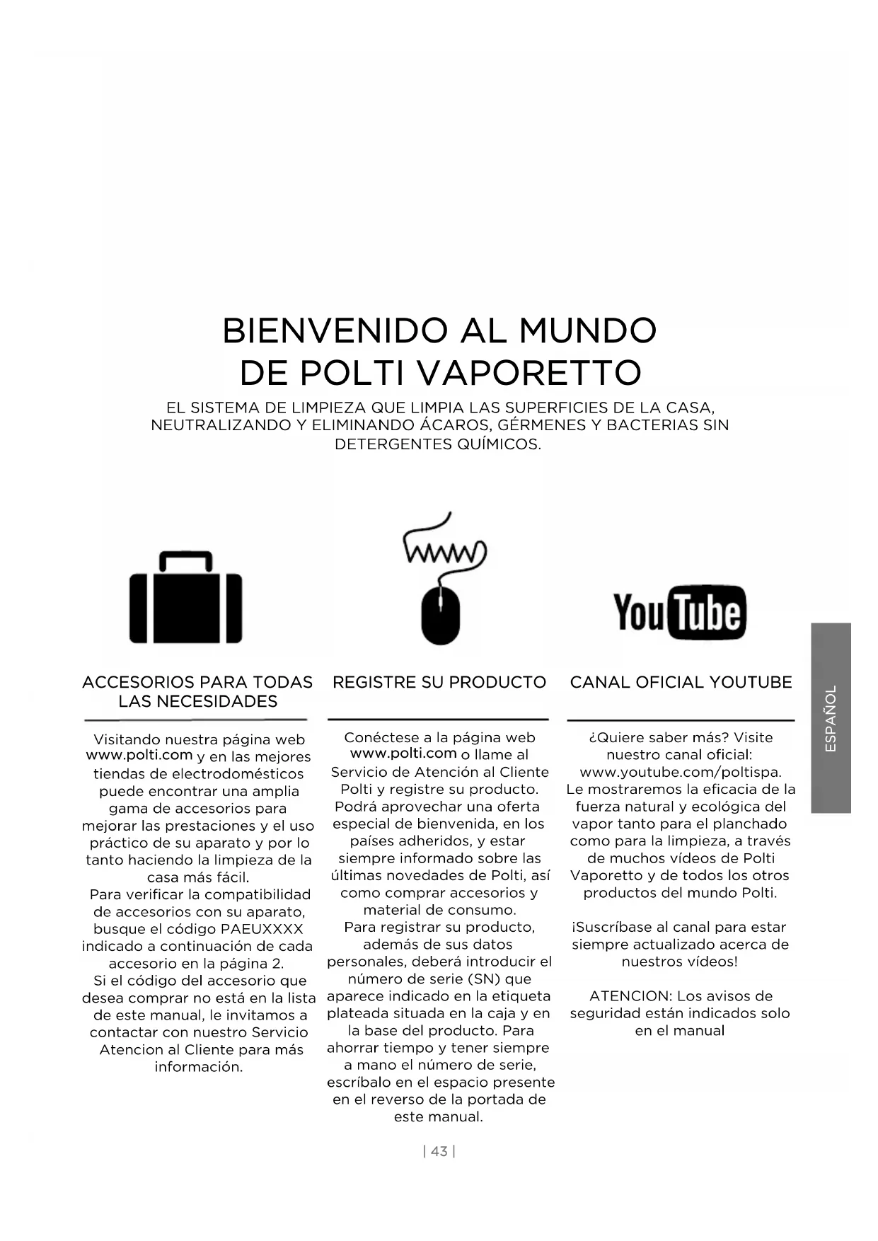¿Quiere saber más? Visite nuestro canal oficial: www.youtube.com/poltispa. Le mostraremos la eficacia de la fuerza natural y ecológica del vapor tanto para el planchado como para la limpieza, a través de muchos vídeos de Polti Vaporetto y de todos los otros productos del mundo Polti. ¡Suscríbase al canal para estar siempre actualizado acerca de nuestros vídeos! ATENCION: Los avisos de seguridad están indicados solo en el manualADVERTENCIAS DE SEGURIDAD ADVERTENCIAS IMPORTANTES ATENCIÓN: ANTES DE UTILIZAR EL APARATO, LEA