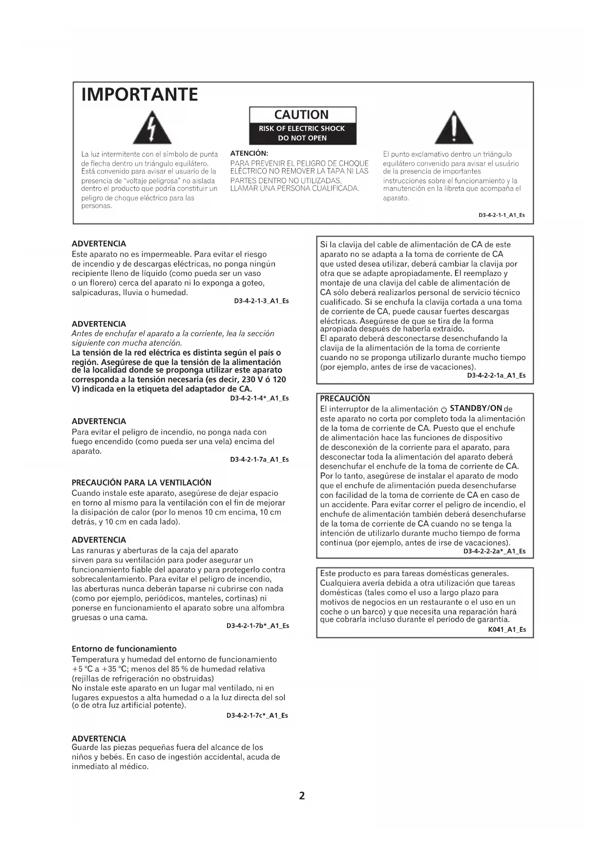 CAUTION RISK OF ELECTRIC SHOCK DO NOT OPEN IMPORTANTE D3-4-2-1-1_A1_Es3