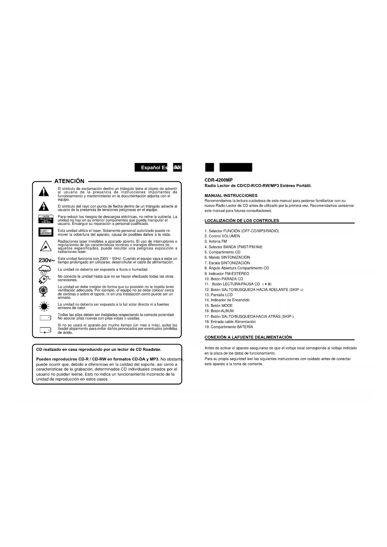 Antes de activar el aparato asegurarse de que el voltaje local corresponda al voltaje indicado en la placa de los datos de funcionamiento. Para su propia seguridad leer las siguientes instrucciones con cuidado antes de conectar este aparato a la toma de corriente. El símbulo de exclamación dentro un triángolo tiene el objeto de advertir al usuario de la presencia de instrucciones importantes de funcionamiento y mantenimiento en la documentación adjunta con el equipo. El símbulo del rayo con punta de flecha dentro de un triángolo adverte al usuario de la presencia de tensiones peligrosas en el equipo. Para reducir los riesgos de descargas eléctricas, no retire la cubierta. La unidad no hay en su enterior componentes que pueda manipular el usuario. Encargue su reparación a personal cualificado. Esta unidad utiliza el laser. Solamente personal autorizado puede re- mover la cobertura del aparato, causa de posibles daños a la vista. Radiaciones laser invisibles a aparado abierto. El uso de interruptores o regulaciones de las caracteristicas tecnicas o manejos diferentes de aquellos especificados, puede resultar una peligrosa exposición a radiaciones laser. Esta unidad funciona con 230V ~ 50Hz. Cuando el equipo vaya a estar un tiempo prolongado sin utilizarse, desenchufar el cable de alimentación. La unidad no debería ser expuesta a lluvia o humedad. No conecte la unidad hasta que no se hayan efectuado todas las otras conexiones. La unidad se debe instalar de forma que su posición no le impida tener ventilación adecuada. Por ejemplo, el equipo no se debe colocar cerca de cortinas o sobre el tapete, ni en una instalación como puede ser un armario. La unidad no debería ser expuesta a la luz solar directa ni a fuentes emisora de calor. Todas las pilas deben ser instaladas respectando la correcta polaridad. No asociar pilas nuevas con pilas viejas o usadas. Si no se usará el aparato por mucho tiempo (un mes o más), quitar las ilasdel alojamiento para evitar daños provocados por eventuales pérdidas de ácido. ATENCIÓN CD realizado en casa reproducido por un lector de CD Roadstar. Pueden reproducirse CD-R / CD-RW en formatos CD-DA y MP3. No obstante, puede ocurrir que, debido a diferencias en la calidad del soporte, así como a características de la grabación, determinados CD individuales creados por el usuario no puedan leerse. Esto no indica un funcionamiento incorrecto de la unidad de reproducción en estos casos.Español Español FUNCIONAMIENTOCONREDCA Este aparato ha sido diseñado para que funcione con una fuente de alimentación de CA 230V, 50Hz. La conexión a otro tipo de fuente de alimentación podría dañar el aparato. Atención Para prevenir las descargas eléctricas desconectar la clavija antes de remover la tapa. No emplearlaspartes utilizables enelinterior.Dirigirseal personal de uncentro deservicios calificado. Precauciones de Seguridad No exponer el aparato a la lluvia o a la humedad. Fuente de Alimentación Principal: solamente CA 230V 50 Hz - CA Este símbolo significa que este aparato está doblemente aislado. No se requiere una conexión a tierra.