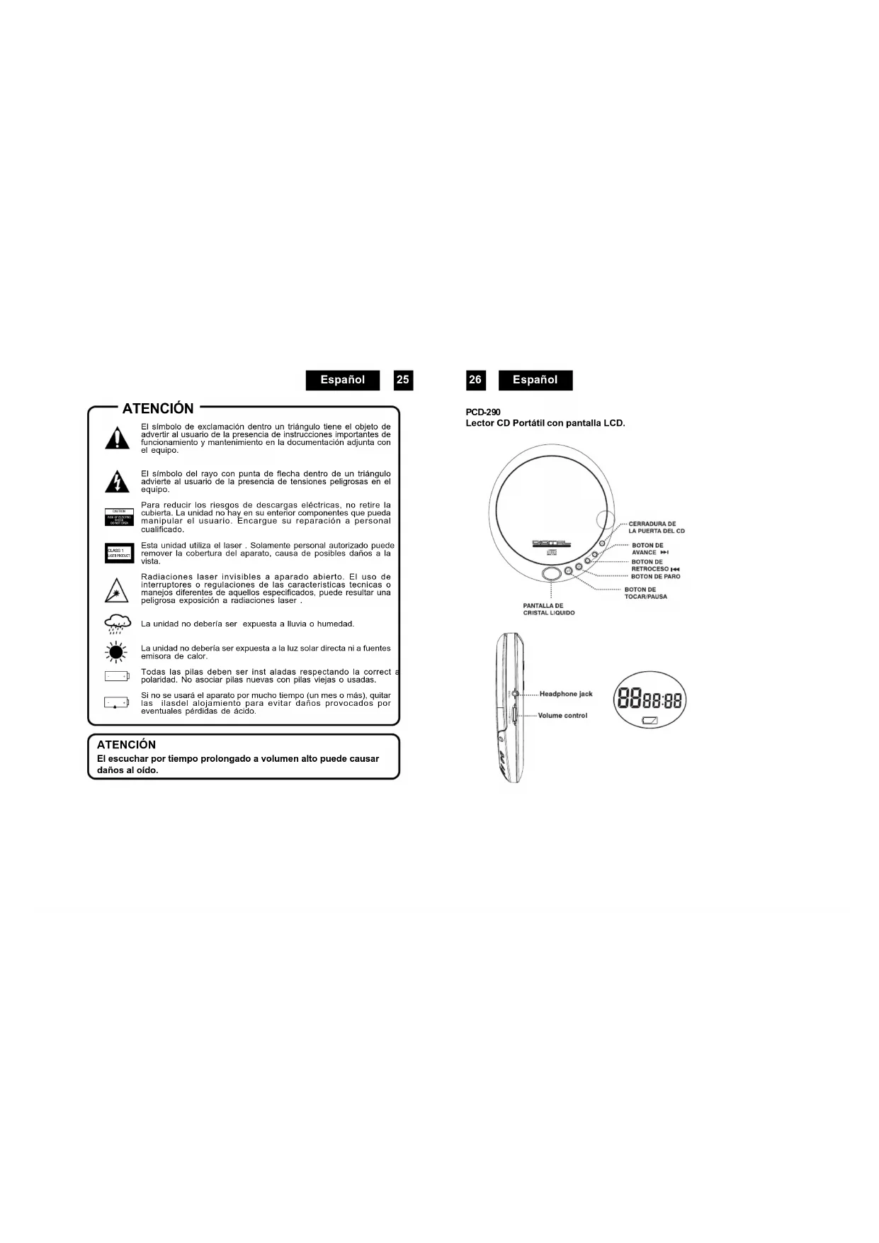El símbolo de exclamación dentro un triángulo tiene el objeto de advertir al usuario de la presencia de instrucciones importantes de funcionamiento y mantenimiento en la documentación adjunta con el equipo. El símbolo del rayo con punta de flecha dentro de un triángulo advierte al usuario de la presencia de tensiones peligrosas en el equipo. Para reducir los riesgos de descargas eléctricas, no retire la cubierta. La unidad no hay en su enterior componentes que pueda manipular el usuario. Encargue su reparación a personal cualificado. Esta unidad utiliza el laser . Solamente personal autorizado puede remover la cobertura del aparato, causa de posibles daños a la vista. Radiaciones laser invisibles a aparado abierto. El uso de interruptores o regulaciones de las caracteristicas tecnicas o manejos diferentes de aquellos especificados, puede resultar una peligrosa exposición a radiaciones laser . La unidad no debería ser expuesta a lluvia o humedad. La unidad no debería ser expuesta a la luz solar directa ni a fuentes emisora de calor. Todas las pilas deben ser inst aladas respectando la correct a polaridad. No asociar pilas nuevas con pilas viejas o usadas. Si no se usará el aparato por mucho tiempo (un mes o más), quitar las ilasdel alojamiento para evitar daños provocados por eventuales pérdidas de ácido. LASER PRODUCT CLASS 1 ATENCIÓN El escuchar por tiempo prolongado a volumen alto puede causar daños al oído. PCD-290 Lector CD Portátil con pantalla LCD. Español 25 26 EspañolLOCALIZACIÓN DE UNA MELODÍA PARTICULAR O DE UN PUNTO DE LA MELODÍA