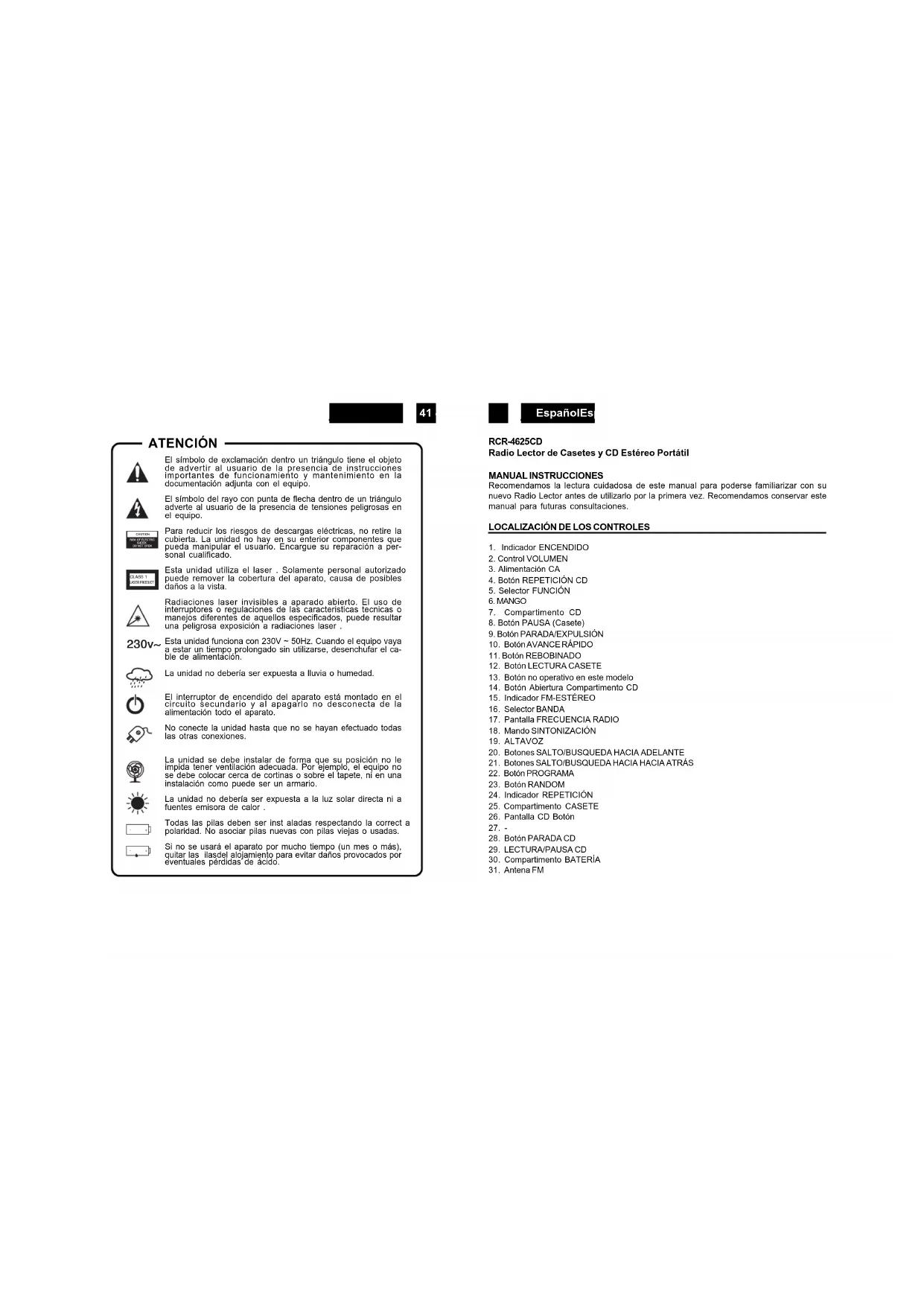 El símbolo de exclamación dentro un triángulo tiene el objeto de advertir al usuario de la presencia de instrucciones importantes de funcionamiento y mantenimiento en la documentación adjunta con el equipo. El símbolo del rayo con punta de flecha dentro de un triángulo adverte al usuario de la presencia de tensiones peligrosas en el equipo. Para reducir los riesgos de descargas eléctricas, no retire la cubierta. La unidad no hay en su enterior componentes que pueda manipular el usuario. Encargue su reparación a per- sonal cualificado. Esta unidad utiliza el laser . Solamente personal autorizado puede remover la cobertura del aparato, causa de posibles daños a la vista. Radiaciones laser invisibles a aparado abierto. El uso de interruptores o regulaciones de las caracteristicas tecnicas o manejos diferentes de aquellos especificados, puede resultar una peligrosa exposición a radiaciones laser . Esta unidad funciona con 230V ~ 50Hz. Cuando el equipo vaya a estar un tiempo prolongado sin utilizarse, desenchufar el ca- ble de alimentación. La unidad no debería ser expuesta a lluvia o humedad. El interruptor de encendido del aparato está montado en el circuito secundario y al apagarlo no desconecta de la alimentación todo el aparato. No conecte la unidad hasta que no se hayan efectuado todas las otras conexiones. La unidad se debe instalar de forma que su posición no le impida tener ventilación adecuada. Por ejemplo, el equipo no se debe colocar cerca de cortinas o sobre el tapete, ni en una instalación como puede ser un armario. La unidad no debería ser expuesta a la luz solar directa ni a fuentes emisora de calor . Todas las pilas deben ser inst aladas respectando la correct a polaridad. No asociar pilas nuevas con pilas viejas o usadas. Si no se usará el aparato por mucho tiempo (un mes o más), quitar las ilasdel alojamiento para evitar daños provocados por eventuales pérdidas de ácido.