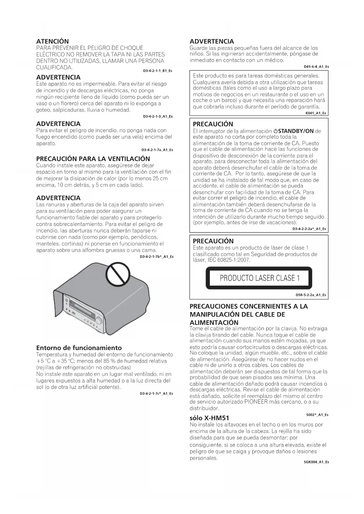 • Sección del amplificador Potencia de salida RMS:. . . . . . . . . . . . . . . . . . . . . . . . . . . . . . . . . . . . . . . . 50 W + 50 W(1 kHz, 10 % T.H.D., 4 :) • Sección del sintonizador Intervalo de frecuencia (FM) . . . . . . . De 87,5 MHz a 108 MHz Entrada de antena (FM) . . . . . . . . . . . . . . .75 : no equilibrada Intervalo de frecuencia (AM). . . . . . . . De 522 kHz a 1620 kHzAntena (AM) . . . . . . . . . . . . . . . . . . . . . . . . . Antena de cuadro • Varios Terminal USB . . . . . . . . . . . . . . . . . . . . . . . . . . . . . . . .5 V, 2,1 AFuente de alimentación. . . . . . . . . . . . . . . . . . . . . . . CA de 220 V a 240 V, 50 Hz/60 HzConsumo eléctricoEncendido. . . . . . . . . . . . . . . . . . . . . . . . . . . . . . . . . . . . 36 WReserva de alimentación. . . . . . . . . . . . . . . .0,5 W o menosDimensiones. . . . . . . . . . . . .215 mm (An) x 100,5 mm (Al) x 325 mm (Prof)Peso (sin el embalaje) . . . . . . . . . . . . . . . . . . . . . . . . . . . 2,3 kg • Altavoz (sólo X-HM51) Sistema de altavoces protegidos magnéticamente Tipo Sistema de altavoces del tipo de 2 víasTweeter en domo de 2,5 cmAltavoz para sonidos graves, tipo cónico, de 12 cmPotencia máxima de entrada . . . . . . . . . . . . . . . . . . . . . . 50 W Impedancia . . . . . . . . . . . . . . . . . . . . . . . . . . . . . . . . . . . . . 4 : Dimensiones. . . . . . . . . . . . .156 mm (An) x 241,5 mm (Al) x 243 mm (Prof)Peso. . . . . . . . . . . . . . . . . . . . . . . . . . . . . . . . . . 3,4 kg/cada uno • Accesorios Mando a distancia . . . . . . . . . . . . . . . . . . . . . . . . . . . . . . . . . . 1Cable de antena de AM . . . . . . . . . . . . . . . . . . . . . . . . . . . . . . 1Antena de hilo de FM. . . . . . . . . . . . . . . . . . . . . . . . . . . . . . . . 1Pilas AAA (R03) . . . . . . . . . . . . . . . . . . . . . . . . . . . . . . . . . . . . 2Cable de altavoz (sólo X-HM51). . . . . . . . . . . . . . . . . . . . . . . . 2Soporte de iPad . . . . . . . . . . . . . . . . . . . . . . . . . . . . . . . . . . . . 1Cable de alimentaciónTarjeta de garantíaManual de instrucciones (este manual) Nota• Las especificaciones son aplicables cuando la alimentación es de 230 V.• Las especificaciones y el diseño están sujetos a posibles modificaciones sin previo aviso, debido a mejoras.© 2013 PIONEER CORPORATION.Todos los derechos reservados. ;+0B6<;(B(VERRN࣮࣌ࢪ㸰㸮㸯㸱ᖺ㸱᭶㸰㸶᪥ࠉᮌ᭙᪥ࠉ༗ᚋ㸳㸯㸵ศВНИМАНИЕ
