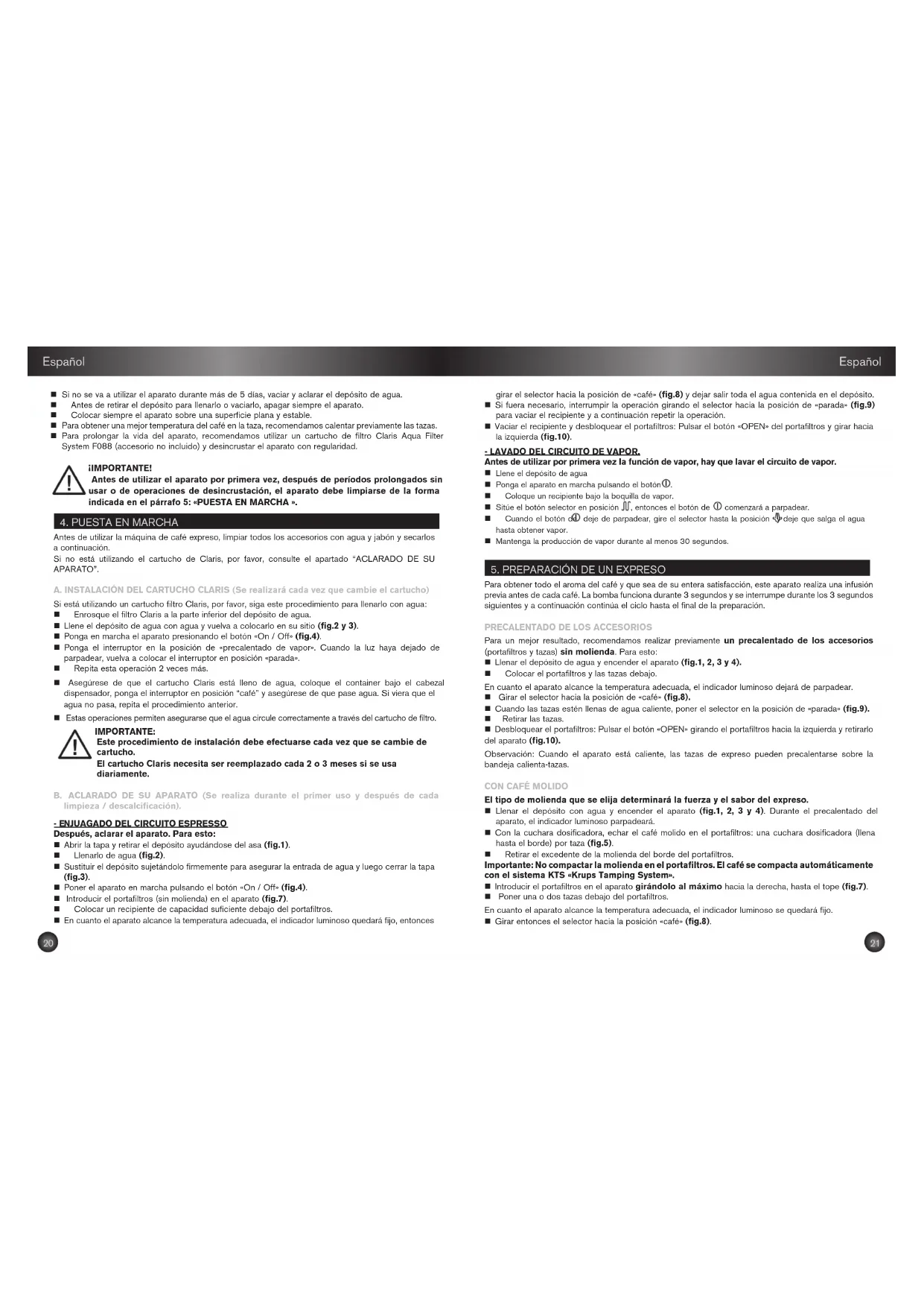 Elegir una molienda ligeramente más gruesa. Limpiar el portafiltros (ver párrafo 8).Cuando enfríe el aparato, limpiar el cabezal de percolación con una esponja húmeda. (fig.21)El agua no pasa.No hay agua en el depósito. Depósito mal montado.El filtro está atascado, la molienda es demasiado fina.El aparato tiene cal.Se ha cambiado el cartucho Claris, pero no se ha preparadoLlenar el depósito. Presionar el depósito con fuerza.Limpiar el portafiltros (ver párrafo 8) y probar con una molienda más fina.Ver párrafo 9.Consulte el párrafo 5Sale agua del portafiltros después de preparar un expreso.El selector no se ha colocada en la posición de «parada».Formación de cal prematura debido a un agua especialmente calcárea.Apagar el aparato girando el selector hacia la posición de «parada». (fig.9). Desincrustar el aparato según las instrucciones de uso (ver párrafo 9).Presencia de poso en la taza.El portafiltros está atascado.