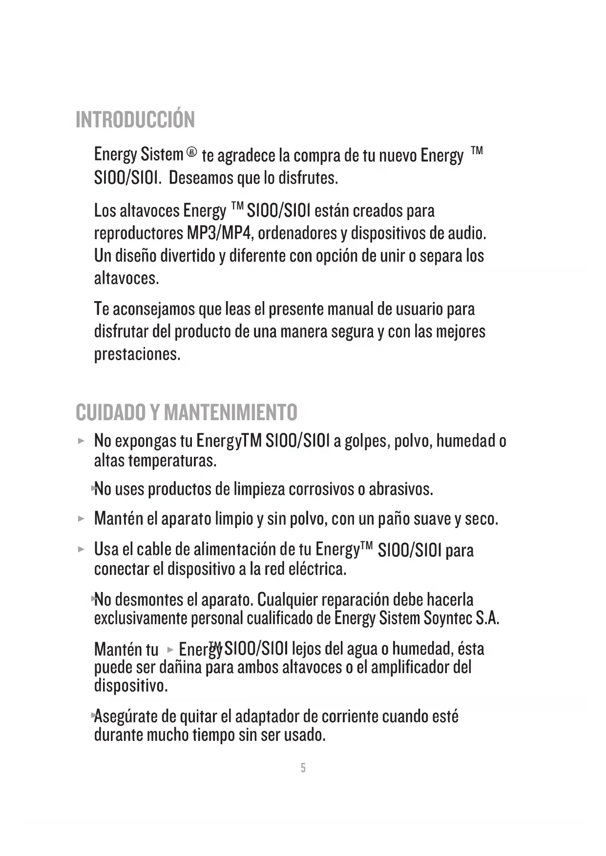 Energy Sistem® te agradece la compra de tu nuevo Energy™ SI00/SI01. Deseamos que lo disfrutes.