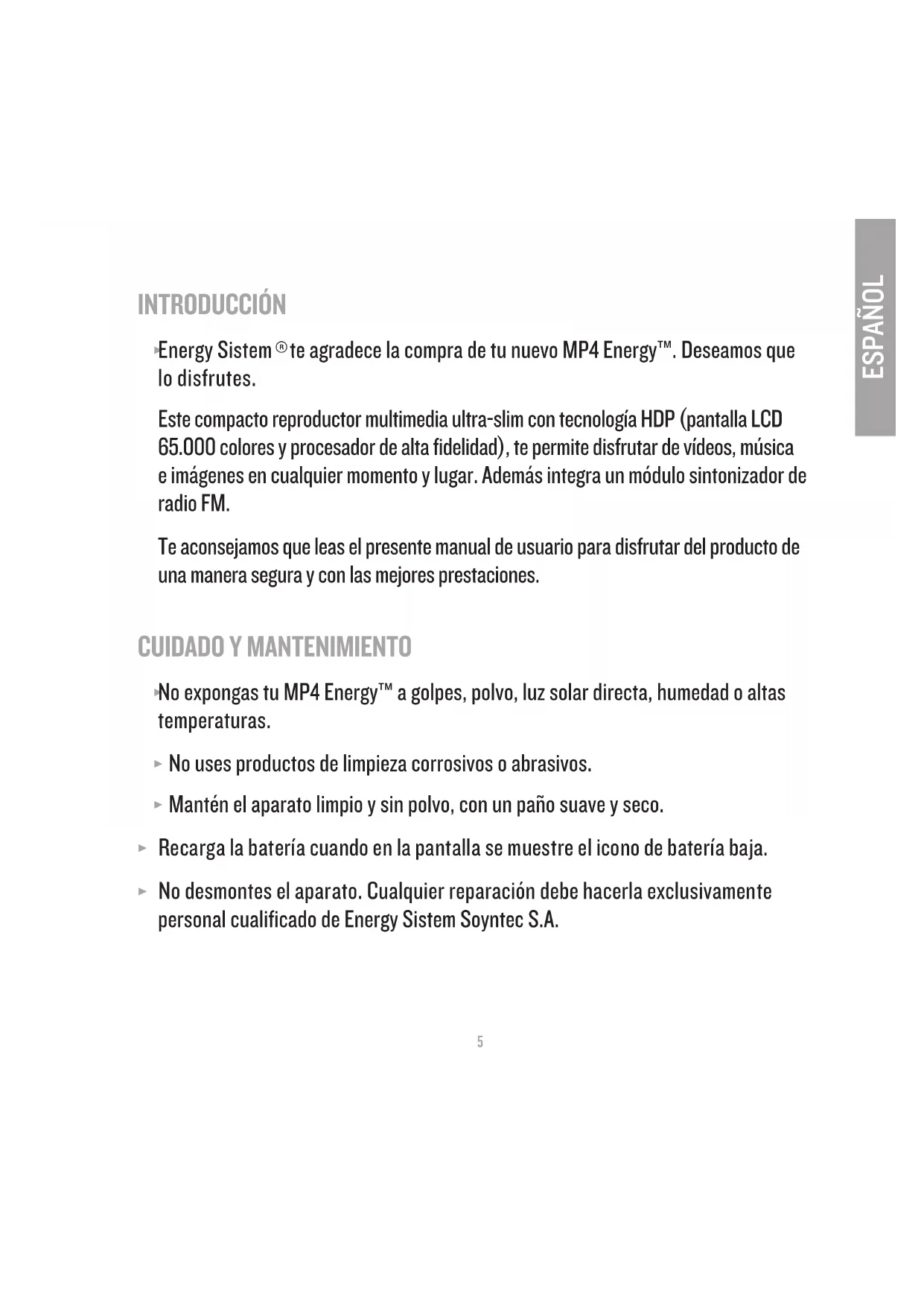 Energy Sistem ^® te agradece la compra de tu nuevo MP4 Energy ^™ . Deseamos que lo disfrutes.