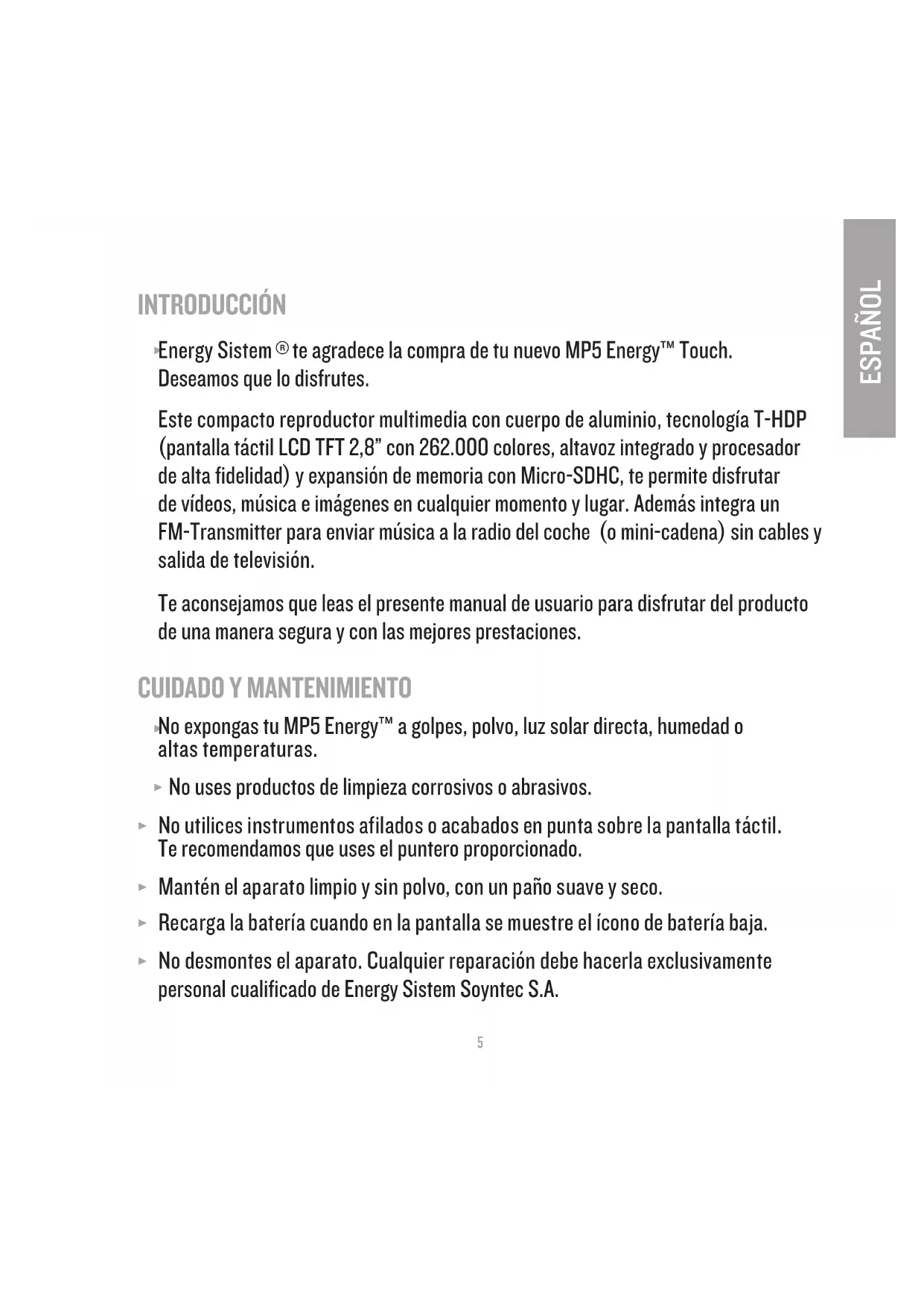 te agradece la compra de tu nuevo MP5 Energy™ Touch. Deseamos que lo disfrutes. Este compacto reproductor multimedia con cuerpo de aluminio, tecnología T-HDP (pantalla táctil LCD TFT 2,8” con 262.000 colores, altavoz integrado y procesador de alta fidelidad) y expansión de memoria con Micro-SDHC, te permite disfrutar de vídeos, música e imágenes en cualquier momento y lugar. Además integra un FM-Transmitter para enviar música a la radio del coche (o mini-cadena) sin cables y salida de televisión. Te aconsejamos que leas el presente manual de usuario para disfrutar del producto de una manera segura y con las mejores prestaciones.