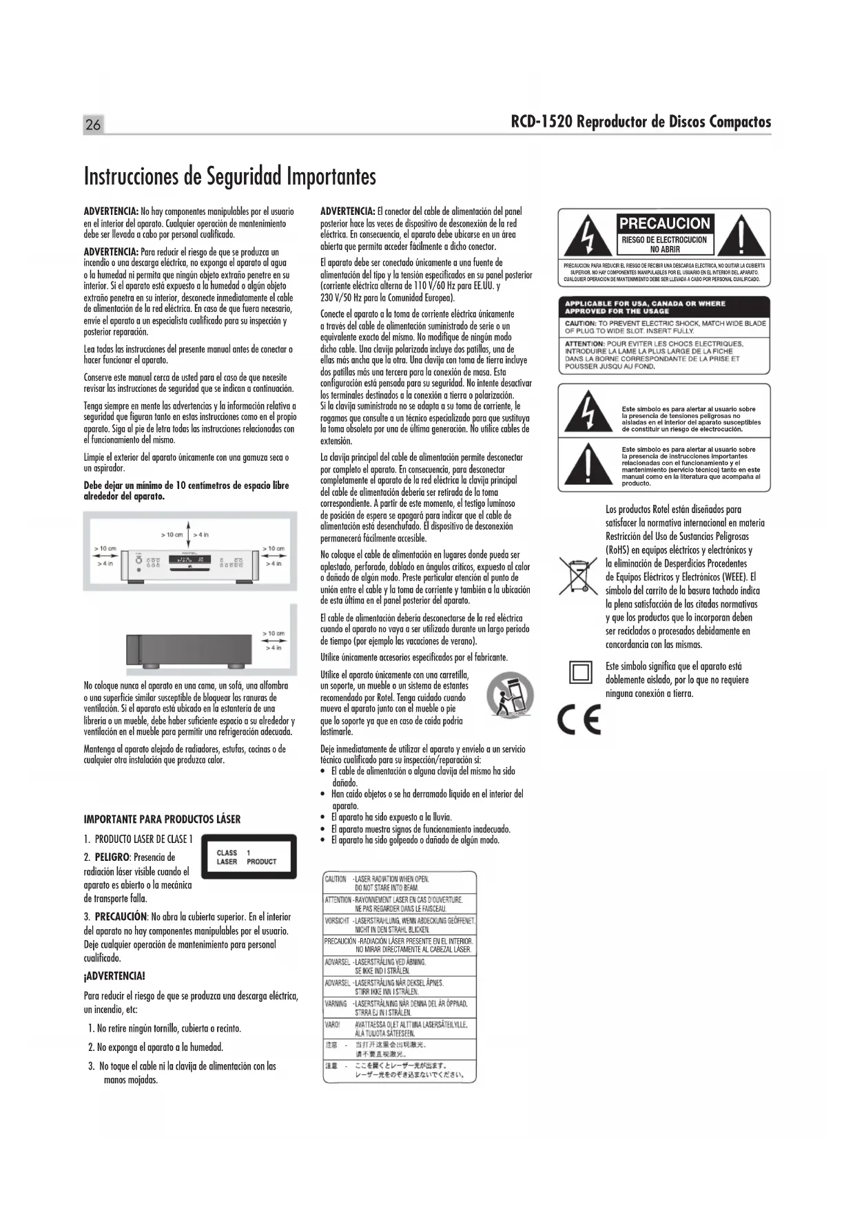Normalerweise zeigt der RCD-1520 die abgelaufene Spieldauer des laufenden Titels an. Über die TIME-Taste haben Sie nun die Möglich- keit, weitere Zeitanzeigen aufzurufen. Drücken Sie die TIME-Taste einmal, so wird im Display die verbleibende Spieldauer von der jeweiligen Wiedergabeposition bis zum Ende des laufenden Titels angezeigt. Wird die TIME-Taste ein zweites Mal gedrückt, erscheint die auf der gesamten Disc (oder die vom gespeicherten Programm) verbleibende Zeit. Erscheinen die alternativen Zeitanzeigen, wird das Icon „R“ im Display angezeigt. Drücken Sie die TIME-Taste ein drittes Mal, so sehen Sie im Display wiederum die abgelaufene Spieldauer des laufenden Titels. HINWEIS: Bei der Wiedergabe von MP3‑ und WMA‑Discs können nur die abgelaufene Spieldauer und die verbleibende Spieldauer des aktuellen Titels angezeigt werden. Bei Störungen Tritt eine scheinbare Fehlfunktion auf, sollten zuerst die nachstehend aufgeführten Punkte überprüft werden. Viele Probleme beruhen auf einfachen Bedienungsfehlern oder fehlerhaften Anschlüssen. Lässt sich das Problem nicht beheben, wenden Sie sich bitte an Ihren autorisier- ten Rotel-Fachhändler. Die POWER-Anzeige leuchtet nicht Bei ordnungsgemäßem Betrieb beginnen die POWER-Anzeige und die grundlegenden Bereiche im Displayfenster zu leuchten, wenn der RCD-1520 an eine stromführende Wandsteckdose angeschlossen ist und der POWER-Schalter gedrückt wird. Leuchten sie nicht, prüfen Sie mit einem anderen elektrischen Verbraucher, z.B. einer Lampe, ob die Steckdose tatsächlich Strom führt. Prüfen Sie, ob der Strom nicht durch einen dazwischen sitzenden Schalter abgeschaltet worden ist.25 Deutsch Technische Daten THD + Rauschen (bei 1 kHz) 0,0045 % Intermodulationsverzerrung (bei 1 kHz) 0,0045 % Frequenzgang (+/‑0,5 dB) 20 – 20.000 Hz Kanalgleichgewicht +/-0,5 dB Phasenlinearität +/-0,5 Grad Kanaltrennung (bei 1 kHz) >98 dB Geräuschspannungsabstand >100 dB Dynamikbereich >96 dB D/A-Wandler Wolfson Gleichlaufschwankungen quarzstabilisiert Ausgangsimpedanz 100 Ohm Digitalausgang (koaxial) 0,5 Volt, Spitze/Spitze Impedanz (Digitalausgang) 75 Ohm Stromversorgung Europa: 230 V, 50 Hz USA: 120 V, 60 Hz Leistungsaufnahme 20 Watt Abmessungen (B x H x T) 431 x 99 x 320 mm Höhe der Gerätefront (für Rack‑Einbau) 88,1 mm Nettogewicht 6,5 kg Diese Bedienungsanleitung entspricht dem technischen Stand bei Drucklegung. Änderungen in Technik und Ausstattung vorbehalten. Rotel und das Rotel HiFi-Logo sind eingetragene Warenzeichen von The Rotel Co. Ltd., Tokio, Japan. Austauschen der Sicherung Funktioniert ein anderes elektrisches Gerät und der RCD-1520 nicht, so kann dies ein Hinweis darauf sein, dass die Grobsicherung im Gehäuseinnern durchgebrannt ist. Trennen Sie das Gerät vom Netz und lassen Sie die Sicherung von Ihrem autorisierten Rotel-Fachhändler auswechseln. Kein Ton Prüfen Sie, ob die Kabel zwischen dem RCD-1520 und dem Verstärker ordnungsgemäß angeschlossen sind. Stellen Sie sicher, dass der RCD- 1520 am Verstärker als Signalquelle eingestellt wurde. Vergewissern Sie sich, dass das Tape-Monitor-System des Verstärkers nicht aktiviert ist. Prüfen Sie alle Verbindungskabel zwischen dem Verstärker und den Lautsprechern.26 RCD-1520 Reproductor de Discos Compactos ADVERTENCIA: No hay componentes manipulables por el usuario en el interior del aparato. Cualquier operación de mantenimiento debe ser llevada a cabo por personal cualificado.ADVERTENCIA: Para reducir el riesgo de que se produzca un incendio o una descarga eléctrica, no exponga el aparato al agua o la humedad ni permita que ningún objeto extraño penetre en su interior. Si el aparato está expuesto a la humedad o algún objeto extraño penetra en su interior, desconecte inmediatamente el cable de alimentación de la red eléctrica. En caso de que fuera necesario, envíe el aparato a un especialista cualificado para su inspección y posterior reparación. Lea todas las instrucciones del presente manual antes de conectar o hacer funcionar el aparato. Conserve este manual cerca de usted para el caso de que necesite revisar las instrucciones de seguridad que se indican a continuación. Tenga siempre en mente las advertencias y la información relativa a seguridad que figuran tanto en estas instrucciones como en el propio aparato. Siga al pie de letra todas las instrucciones relacionadas con el funcionamiento del mismo.Limpie el exterior del aparato únicamente con una gamuza seca o un aspirador.Debe dejar un mínimo de 10 centímetros de espacio libre alrededor del aparato. No coloque nunca el aparato en una cama, un sofá, una alfombra o una superficie similar susceptible de bloquear las ranuras de ventilación. Si el aparato está ubicado en la estantería de una librería o un mueble, debe haber suficiente espacio a su alrededor y ventilación en el mueble para permitir una refrigeración adecuada. Mantenga al aparato alejado de radiadores, estufas, cocinas o de cualquier otra instalación que produzca calor. Los productos Rotel están diseñados para satisfacer la normativa internacional en materia Restricción del Uso de Sustancias Peligrosas (RoHS) en equipos eléctricos y electrónicos y la eliminación de Desperdicios Procedentes de Equipos Eléctricos y Electrónicos (WEEE). El símbolo del carrito de la basura tachado indica la plena satisfacción de las citadas normativas y que los productos que lo incorporan deben ser reciclados o procesados debidamente en concordancia con las mismas. Este símbolo significa que el aparato está doblemente aislado, por lo que no requiere ninguna conexión a tierra. Instrucciones de Seguridad Importantes ADVERTENCIA: El conector del cable de alimentación del panel posterior hace las veces de dispositivo de desconexión de la red eléctrica. En consecuencia, el aparato debe ubicarse en un área abierta que permita acceder fácilmente a dicho conector.El aparato debe ser conectado únicamente a una fuente de ali