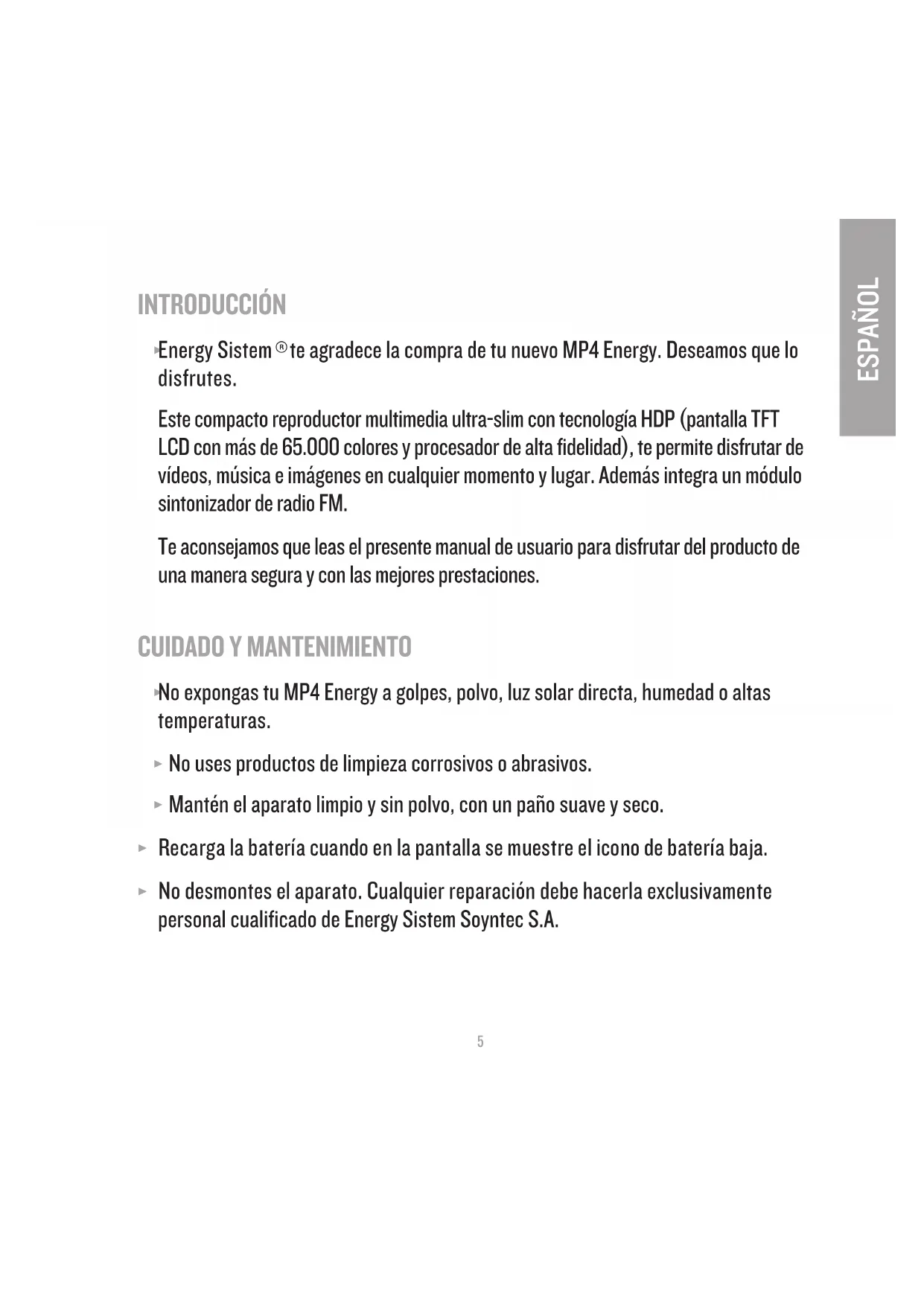 te agradece la compra de tu nuevo MP4 Energy. Deseamos que lo disfrutes. Este compacto reproductor multimedia ultra-slim con tecnología HDP (pantalla TFT LCD con más de 65.000 colores y procesador de alta fidelidad), te permite disfrutar de vídeos, música e imágenes en cualquier momento y lugar. Además integra un módulo sintonizador de radio FM. Te aconsejamos que leas el presente manual de usuario para disfrutar del producto de una manera segura y con las mejores prestaciones.