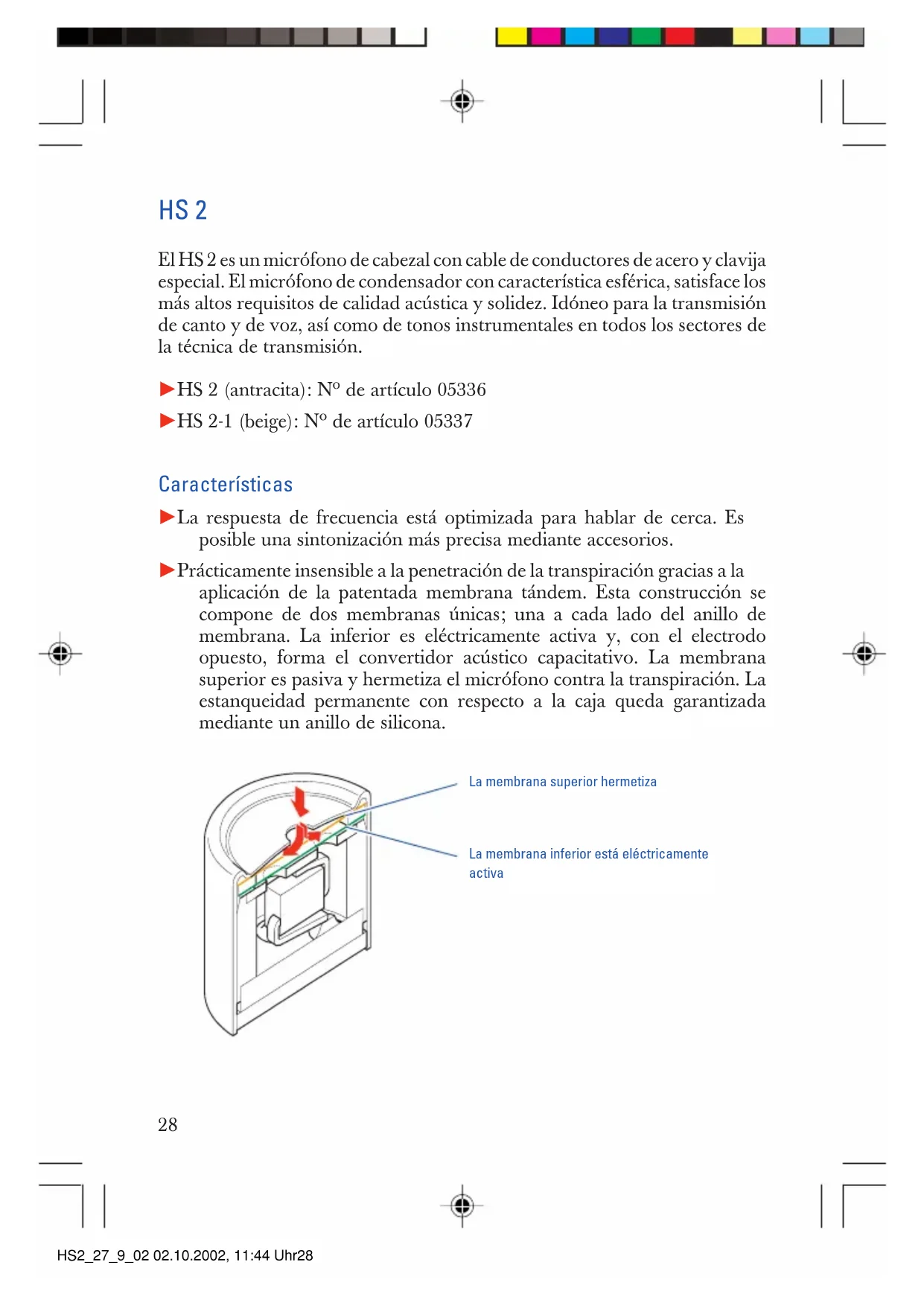 HS2_27_9_02 02.10.2002, 11:44 Uhr2728 La membrana superior hermetiza La membrana inferior está eléctricamente activa HS 2 El HS 2 es un micrófono de cabezal con cable de conductores de acero y clavija especial. El micrófono de condensador con característica esférica, satisface los más altos requisitos de calidad acústica y solidez. Idóneo para la transmisión de canto y de voz, así como de tonos instrumentales en todos los sectores de la técnica de transmisión. 씰 HS 2 (antracita): Nº de artículo 05336 씰 HS 2-1 (beige): Nº de artículo 05337 Características 씰 La respuesta de frecuencia está optimizada para hablar de cerca. Es posible una sintonización más precisa mediante accesorios. 씰 Prácticamente insensible a la penetración de la transpiración gracias a la aplicación de la patentada membrana tándem. Esta construcción se compone de dos membranas únicas; una a cada lado del anillo de membrana. La inferior es eléctricamente activa y, con el electrodo opuesto, forma el convertidor acústico capacitativo. La membrana superior es pasiva y hermetiza el micrófono contra la transpiración. La estanqueidad permanente con respecto a la caja queda garantizada mediante un anillo de silicona. HS2_27_9_02 02.10.2002, 11:44 Uhr2829 Elevación de agudos mediante caperuza enchufable Como accesorios para su micrófono están disponibles dos caperuzas enchufables de diferente longitud. Con estas caperuzas puede influenciarse la transmisión de agudos. Corra la caperuza sobre el cabezal del micrófono hasta el segundo tope. Observe el diagrama de frecuencia expuestos en la página 38. 씰 Caperuza enchufable corta: MZC2-1 Nº de artículo 76612 씰 Caperuza enchufable larga: MZC2-2 Nº de artículo 74645 Fijación del micrófono HS2_27_9_02 02.10.2002, 11:44 Uhr2930 MZW 2 MZW 02 Protección contra el viento En las entrevistas a corta distancia y tomas en exteriores molestan los ruidos del aliento y del viento. Este efecto se reduce significantemente mediante los componentes de protección contra el viento MZW 2 y MZW 02. Sírvase primeramente de la protección contra el viento MZW 2. Impide los ruidos de aliento y del viento en aprox. 20 dB Otra reducción de los ruidos del aliento y del viento en 10 dB la consigue con el componente en red de espuma MZW 02. MZW 2 y MZW 02 pueden adquirirse como accesorios. HS2_27_9_02 02.10.2002, 11:44 Uhr3031 Datos técnicos HS 2 HS 2-1 Caraterística direcional Esfera Esfera Gama de transmisión 20-20000 Hz 20-20000 Hz ± 3 dB ± 3 dB Factor de transmisión de campo 5 mV / Pa 5 mV / Pa libre en vacío (1kHz) ± 3 dB ± 3 dB Impedancia nominal 1000 Ω 1000 Ω Impedancia final mínima 4,7 kΩ 4,7 kΩ Nivel de ruidos equivalente Evaluación A (DIN IEC 651) 26 dB 26 dB Evaluación CCIR (CCIR 468-1) 39 dB 39 dB Nivel límite de presión sonora 142 dB 142 dB Alimentación 18 kΩ / 7.5 V 18 kΩ / 7.5 V Enchufe enchufe especial enchufe especial tres polos para tres polos para SK 50 / SK 250 / SK 50 / SK 250 / SK 5012 SK 5012 Color anthracita beige Largo del cable 1,6 m 1,6 m Diámetro del micró 4,8 mm 4,8 mm Peso (con cable) 34,4 g 34,4 g El suministro incluye Instrucciones para el uso 1 1 Tarjeta de garantia 1 1 HS2_27_9_02 02.10.2002, 11:44 Uhr3132 HS2_27_9_02 02.10.2002, 11:44 Uhr32HS 2