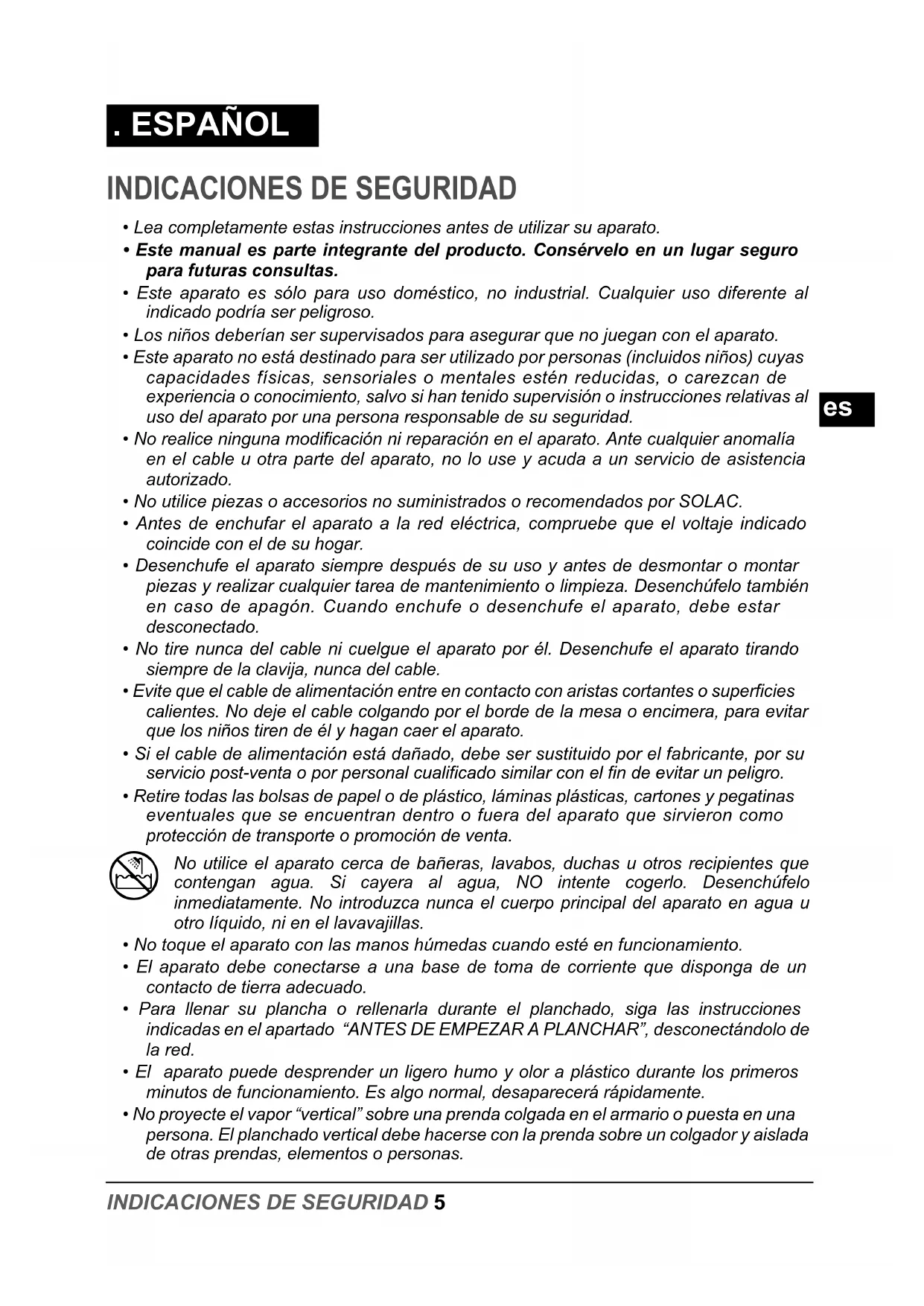 ) Recomendamos clasifique las prendas en función de la temperatura que requieran para su planchado y empiece por las prendas que se planchen con la temperatura más baja (•). , NOTA: Planchar prendas delicadas con una temperatura superior a la necesaria, perjudica al tejido y provoca la adherencia de residuos quemados a la suela. , Si tiene dudas sobre la temperatura a utilizar sobre una determinada prenda, realice una prueba sobre una parte no visible de la misma, comenzando primero con las temperaturas más bajas. UTILIZACIÓN ) Este aparato ha sido diseñado exclusivamente para planchar ropa. No lo emplee para otros usos. ) Retire completamente todos los elementos que sirvieron para su transporte y embalaje. n Si el aparato está caliente, manipúlelo con precaución y no toque la suela metálica. n Nunca deje la plancha con la suela caliente en posición horizontal. Apóyela sobre su parte trasera. n Tenga cuidado con el vapor, no dirija el vapor hacia personas, animales u objetos delicados. n Planche siempre sobre superficies estables, firmes y lisas. ) Para prendas muy delicadas, puede utilizar un paño colocándolo entre la plancha y la prenda delicada, para evitar posibles marcas de la suela. 1 Extienda el cable completamente y enchufe la clavija a la red. Se enciende el piloto de calentamiento (11). Ponga la plancha en posición vertical. 2 Seleccione la temperatura de trabajo deseada según la prenda a planchar (ver “SELECCIÓN DE TEMPERATURA (fig. 4)” ). 3 Seleccione el planchado con vapor (medio o máximo ) o planchado sin vapor , según conveniencia (ver “SELECCIÓN DE VAPOR”). 4 Coja la plancha por el asa y deslice la suela sobre la prenda a planchar. 5 Cuando termine de utilizar la plancha, coloque el selector de caudal de vapor (10) en la posición de cerrado y el selector de temperatura (9) en la posición 0. 6 Desconecte el cable de conexión de la red 7 Vacíe el depósito de agua (ver “VACIADO DEL DEPÓSITO DE AGUA”). Espere a que la plancha esté completamente fría y guárdela en posición vertical en un lugar seguro. FIBRAS SINTÉTICAS, temperatura mínima (•) SEDA, LANA, temperatura media (••) ALGODÓN, temperatura alta (•••) LINO, temperatura MAX8