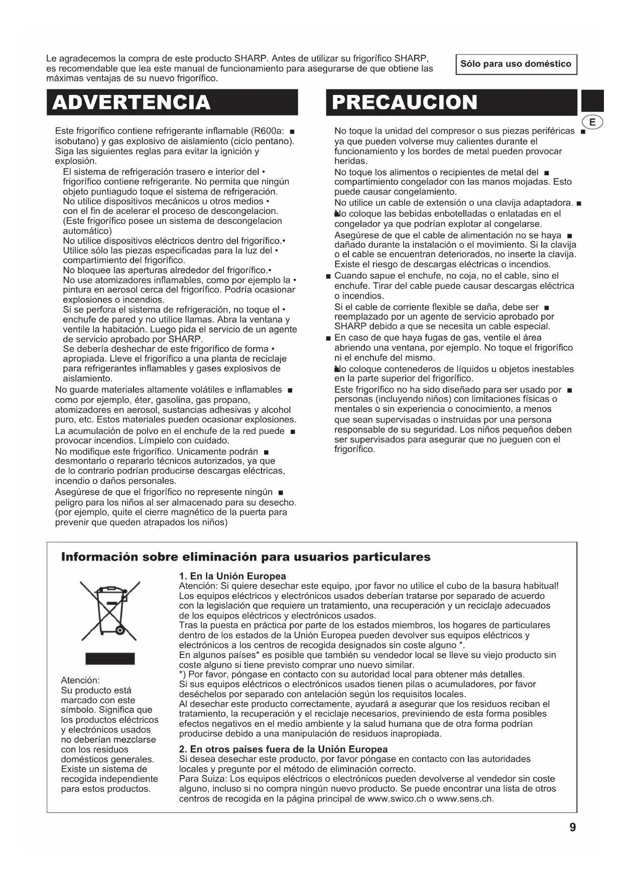 (B191)-West.indb 5 2011/03/14 13:13:159 Sólo para uso doméstico Le agradecemos la compra de este producto SHARP. Antes de utilizar su frigoríco SHARP, es recomendable que lea este manual de funcionamiento para asegurarse de que obtiene las máximas ventajas de su nuevo frigoríco. Este frigoríco contiene refrigerante inamable (R600a: ■ isobutano) y gas explosivo de aislamiento (ciclo pentano). Siga las siguientes reglas para evitar la ignición y explosión. El sistema de refrigeración trasero e interior del • frigoríco contiene refrigerante. No permita que ningún objeto puntiagudo toque el sistema de refrigeración. No utilice dispositivos mecánicos u otros medios • con el n de acelerar el proceso de descongelacion. (Este frigoríco posee un sistema de descongelacion automático) No utilice dispositivos eléctricos dentro del frigoríco.• Utilice sólo las piezas especicadas para la luz del • compartimiento del frigoríco. No bloquee las aperturas alrededor del frigoríco.• No use atomizadores inamables, como por ejemplo la • pintura en aerosol cerca del frigoríco. Podría ocasionar explosiones o incendios. Si se perfora el sistema de refrigeración, no toque el • enchufe de pared y no utilice llamas. Abra la ventana y ventile la habitación. Luego pida el servicio de un agente de servicio aprobado por SHARP. Se debería deshechar de este frigoríco de forma • apropiada. Lleve el frigoríco a una planta de reciclaje para refrigerantes inamables y gases explosivos de aislamiento. No guarde materiales altamente volátiles e inamables ■ como por ejemplo, éter, gasolina, gas propano, atomizadores en aerosol, sustancias adhesivas y alcohol puro, etc. Estos materiales pueden ocasionar explosiones. La acumulación de polvo en el enchufe de la red puede ■ provocar incendios. Límpielo con cuidado. No modique este frigoríco. Unicamente podrán ■ desmontarlo o repararlo técnicos autorizados, ya que de lo contrario podrían producirse descargas eléctricas, incendio o daños personales. Asegúrese de que el frigoríco no represente ningún ■ peligro para los niños al ser almacenado para su desecho. (por ejemplo, quite el cierre magnético de la puerta para prevenir que queden atrapados los niños) ADVERTENCIA PRECAUCION No toque la unidad del compresor o sus piezas periféricas ■ ya que pueden volverse muy calientes durante el funcionamiento y los bordes de metal pueden provocar heridas. No toque los alimentos o recipientes de metal del ■ compartimiento congelador con las manos mojadas. Esto puede causar congelamiento. No utilice un cable de extensión o una clavija adaptadora. ■ No coloque las bebidas enbotelladas o enlatadas en el ■ congelador ya que podrían explotar al congelarse. Asegúrese de que el cable de alimentación no se haya ■ dañado durante la instalación o el movimiento. Si la clavija o el cable se encuentran deteriorados, no inserte la clavija. Existe el riesgo de descargas eléctricas o incendios. Cuando sapue el enchufe, no coja, no el cable, sino el ■ enchufe. Tirar del cable puede causar descargas eléctrica o incendios. Si el cable de corriente exible se daña, debe ser ■ reemplazado por un agente de servicio aprobado por SHARP debido a que se necesita un cable especial. En caso de que haya fugas de gas, ventile el área ■ abriendo una ventana, por ejemplo. No toque el frigoríco ni el enchufe del mismo. No coloque contenederos de líquidos u objetos inestables ■ en la parte superior del frigoríco. Este frigoríco no ha sido diseñado para ser usado por ■ personas (incluyendo niños) con limitaciones físicas o mentales o sin experiencia o conocimiento, a menos que sean supervisadas o instruidas por una persona responsable de su seguridad. Los niños pequeños deben ser supervisados para asegurar que no jueguen con el frigoríco. Información sobre eliminación para usuarios particulares