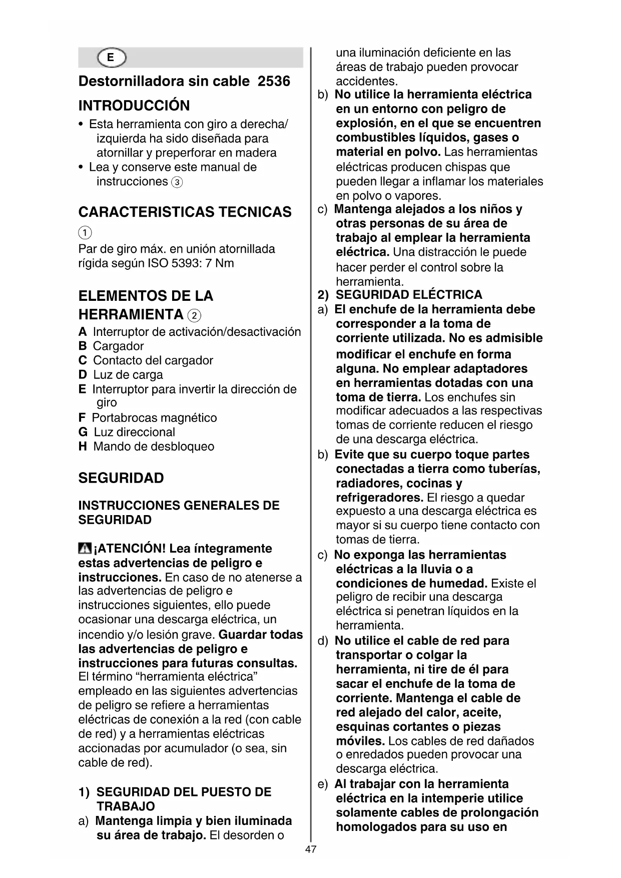 HERRAMIENTA 2 A Interruptor de activación/desactivación B Cargador C Contacto del cargador D Luz de carga E Interruptor para invertir la dirección de giro F Portabrocas magnético G Luz direccional H Mando de desbloqueo SEGURIDAD
