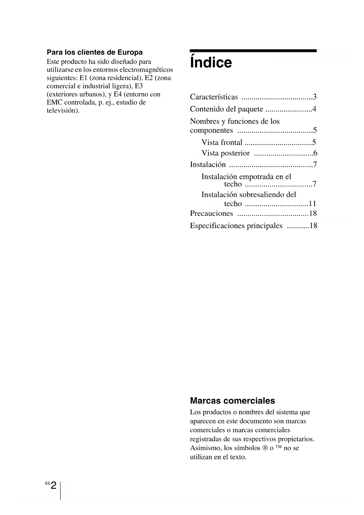 - Para los clientes de Europa Este producto ha sido diseñado para utilizarse en los entornos electromagnéticos siguientes: E1 (zona residencial), E2 (zona comercial e industrial ligera), E3 (exteriores urbanos), y E4 (entorno con EMC controlada, p. ej., estudio de televisión). Índice Características p. 3