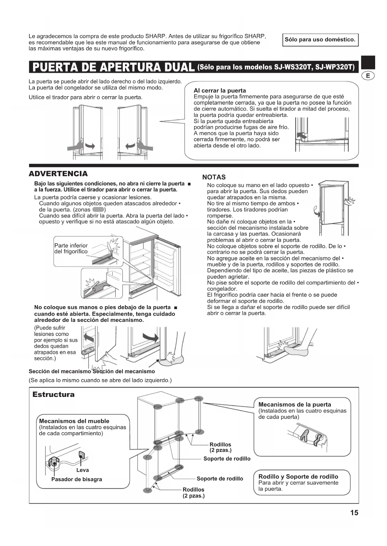 Refer to your nearest service agent approved by SHARP. (B107)_BOOK-W.indb 14 2010/09/28 14:46:4515 No coloque sus manos o pies debajo de la puerta ■cuando esté abierta. Especialmente, tenga cuidado alrededor de la sección del mecanismo.(Puede sufrir lesiones como por ejemplo si sus dedos quedan atrapados en esa sección.)Sólo para uso doméstico. ADVERTENCIA Bajo las siguientes condiciones, no abra ni cierre la puerta ■a la fuerza. Utilice el tirador para abrir o cerrar la puerta.La puerta podría caerse y ocasionar lesiones.Cuando algunos objetos queden atascados alrededor • de la puerta. (zonas Cuando sea difícil abrir la puerta. Abra la puerta del lado • opuesto y verique si no está atascado algún objeto. NOTAS No coloque su mano en el lado opuesto • para abrir la puerta. Sus dedos pueden quedar atrapados en la misma.No tire al mismo tiempo de ambos • tiradores. Los tiradores podrían romperse.No dañe ni coloque objetos en la • sección del mecanismo instalada sobre la carcasa y las puertas. Ocasionará problemas al abrir o cerrar la puerta.No coloque objetos sobre el soporte de rodillo. De lo • contrario no se podrá cerrar la puerta.No agregue aceite en la sección del mecanismo del • mueble y de la puerta, rodillos y soportes de rodillo. Dependiendo del tipo de aceite, las piezas de plástico se pueden agrietar.No pise sobre el soporte de rodillo del compartimiento del • congelador. El frigoríco podría caer hacia el frente o se puede deformar el soporte de rodillo. Si se llega a dañar el soporte de rodillo puede ser difícil abrir o cerrar la puerta. Estructura