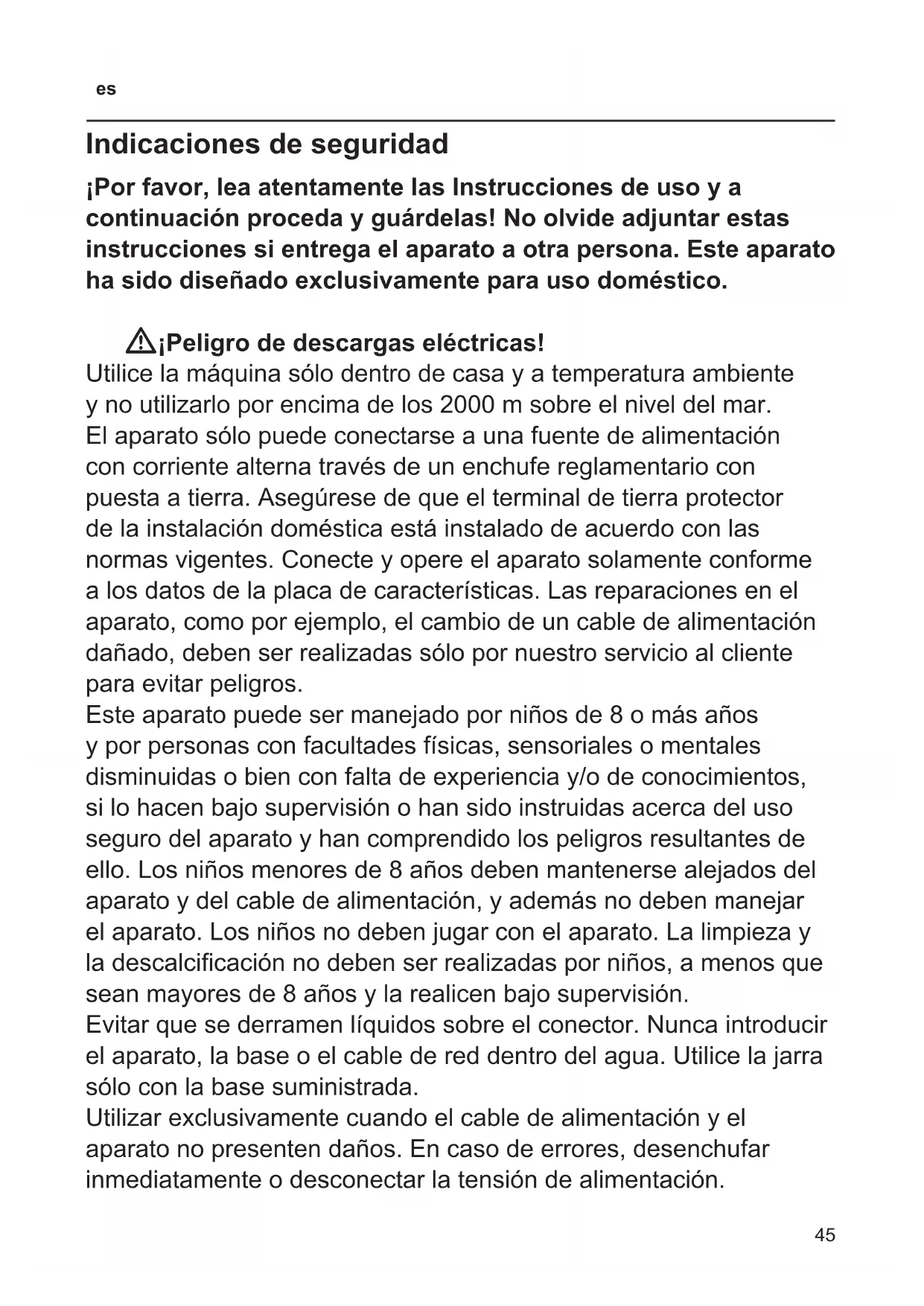 Indicaciones de seguridad ¡Por favor, lea atentamente las Instrucciones de uso y a continuación proceda y guárdelas! No olvide adjuntar estas instrucciones si entrega el aparato a otra persona. Este aparato ha sido diseñado exclusivamente para uso doméstico. W¡Peligro de descargas eléctricas! Utilice la máquina sólo dentro de casa y a temperatura ambiente y no utilizarlo por encima de los 2000 m sobre el nivel del mar. El aparato sólo puede conectarse a una fuente de alimentación con corriente alterna través de un enchufe reglamentario con puesta a tierra. Asegúrese de que el terminal de tierra protector de la instalación doméstica está instalado de acuerdo con las normas vigentes. Conecte y opere el aparato solamente conforme a los datos de la placa de características. Las reparaciones en el aparato, como por ejemplo, el cambio de un cable de alimentación dañado, deben ser realizadas sólo por nuestro servicio al cliente para evitar peligros. Este aparato puede ser manejado por niños de 8 o más años y por personas con facultades físicas, sensoriales o mentales disminuidas o bien con falta de experiencia y/o de conocimientos, si lo hacen bajo supervisión o han sido instruidas acerca del uso seguro del aparato y han comprendido los peligros resultantes de ello. Los niños menores de 8 años deben mantenerse alejados del aparato y del cable de alimentación, y además no deben manejar el aparato. Los niños no deben jugar con el aparato. La limpieza y la descalcicación no deben ser realizadas por niños, a menos que sean mayores de 8 años y la realicen bajo supervisión. Evitar que se derramen líquidos sobre el conector. Nunca introducir el aparato, la base o el cable de red dentro del agua. Utilice la jarra sólo con la base suministrada. Utilizar exclusivamente cuando el cable de alimentación y el aparato no presenten daños. En caso de errores, desenchufar inmediatamente o desconectar la tensión de alimentación.46