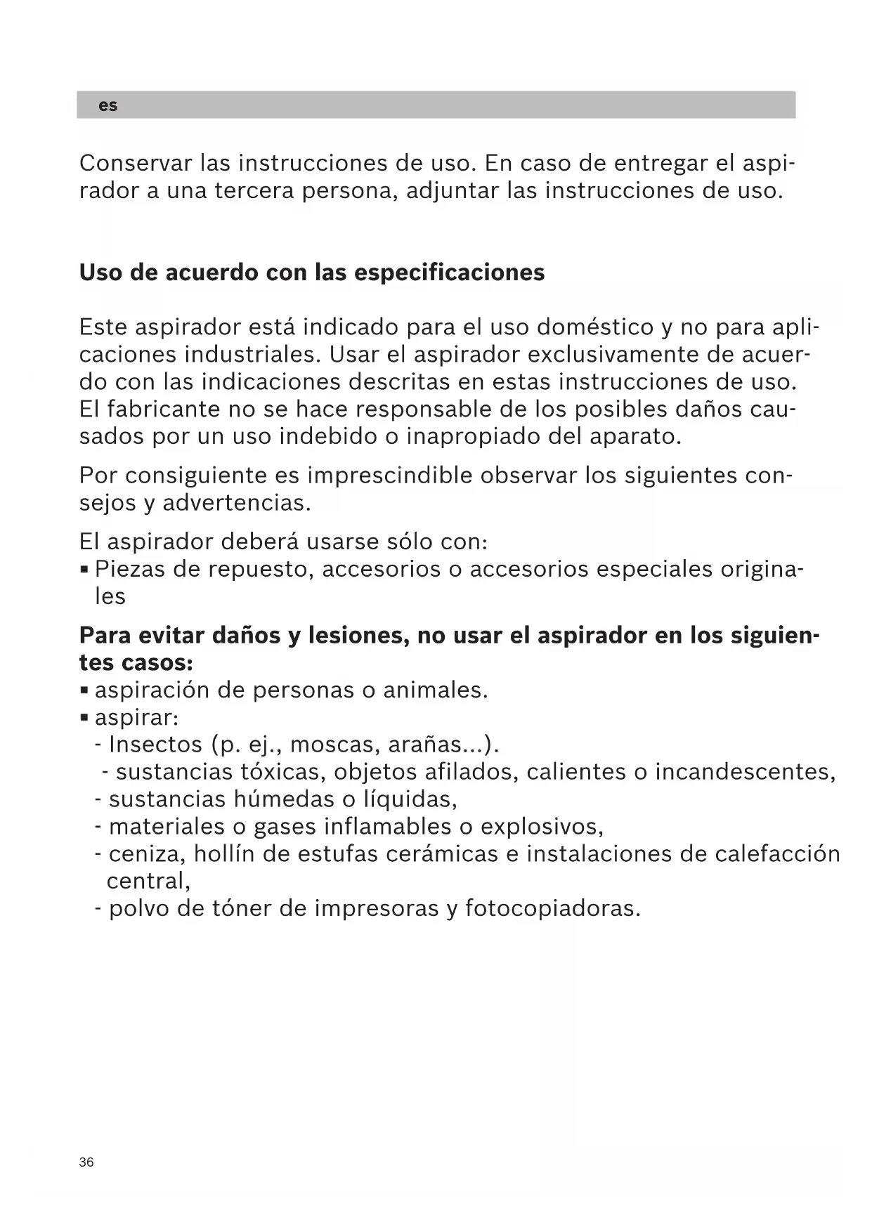 Conservar las instrucciones de uso. En caso de entregar el aspi- rador a una tercera persona, adjuntar las instrucciones de uso. Uso de acuerdo con las especificaciones Este aspirador está indicado para el uso doméstico y no para apli- caciones industriales. Usar el aspirador exclusivamente de acuer- do con las indicaciones descritas en estas instrucciones de uso. El fabricante no se hace responsable de los posibles daños cau- sados por un uso indebido o inapropiado del aparato. Por consiguiente es imprescindible observar los siguientes con- sejos y advertencias. El aspirador deberá usarse sólo con: Piezas de repuesto, accesorios o accesorios especiales origina- les Para evitar daños y lesiones, no usar el aspirador en los siguien- tes casos: aspiración de personas o animales. aspirar: - Insectos (p. ej., moscas, arañas...). - sustancias tóxicas, objetos afilados, calientes o incandescentes, - sustancias húmedas o líquidas, - materiales o gases inflamables o explosivos, - ceniza, hollín de estufas cerámicas e instalaciones de calefacción central, - polvo de tóner de impresoras y fotocopiadoras.de