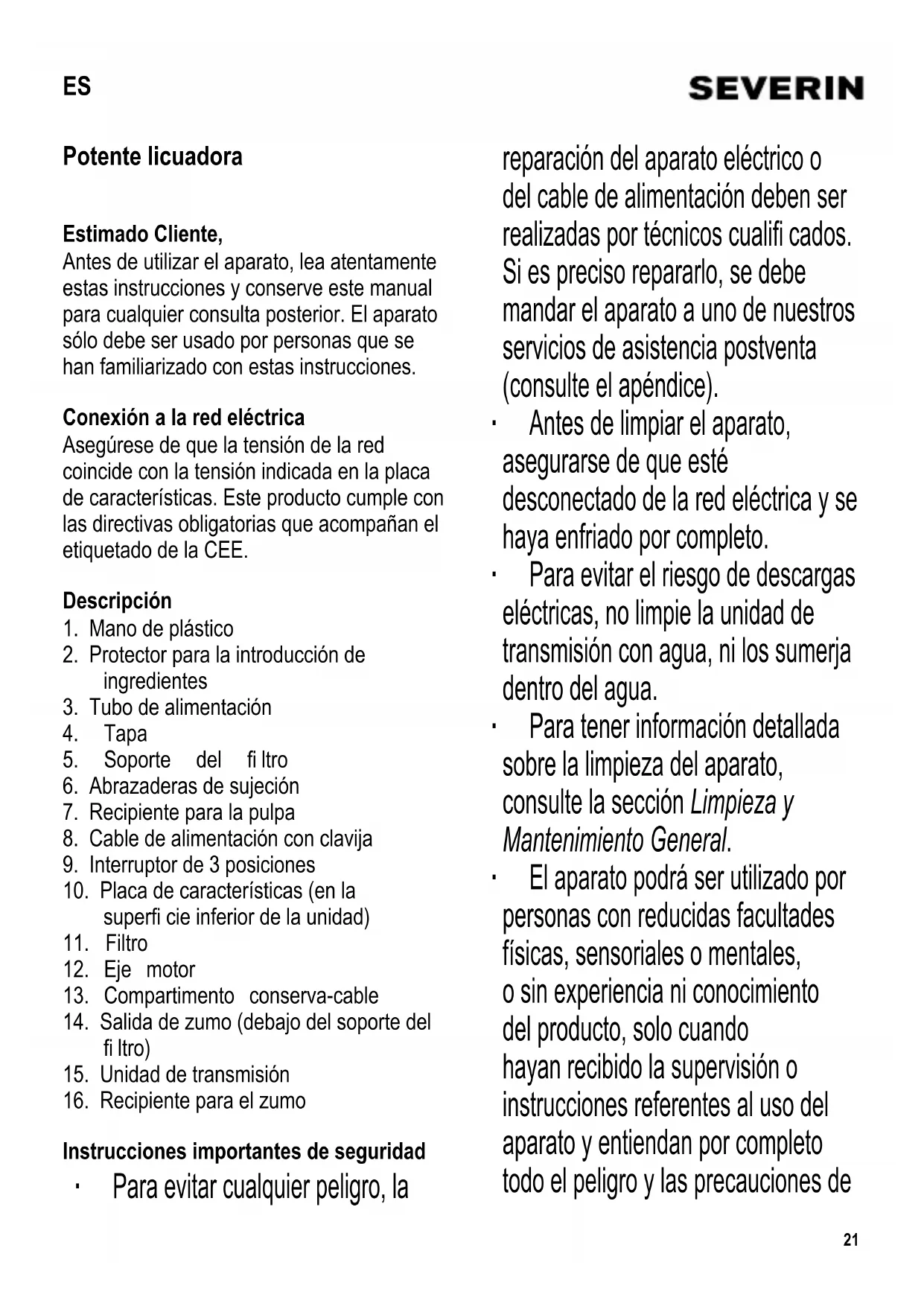 Encuentra gratis el manual del aparato ES 3562 SEVERIN en formato PDF.