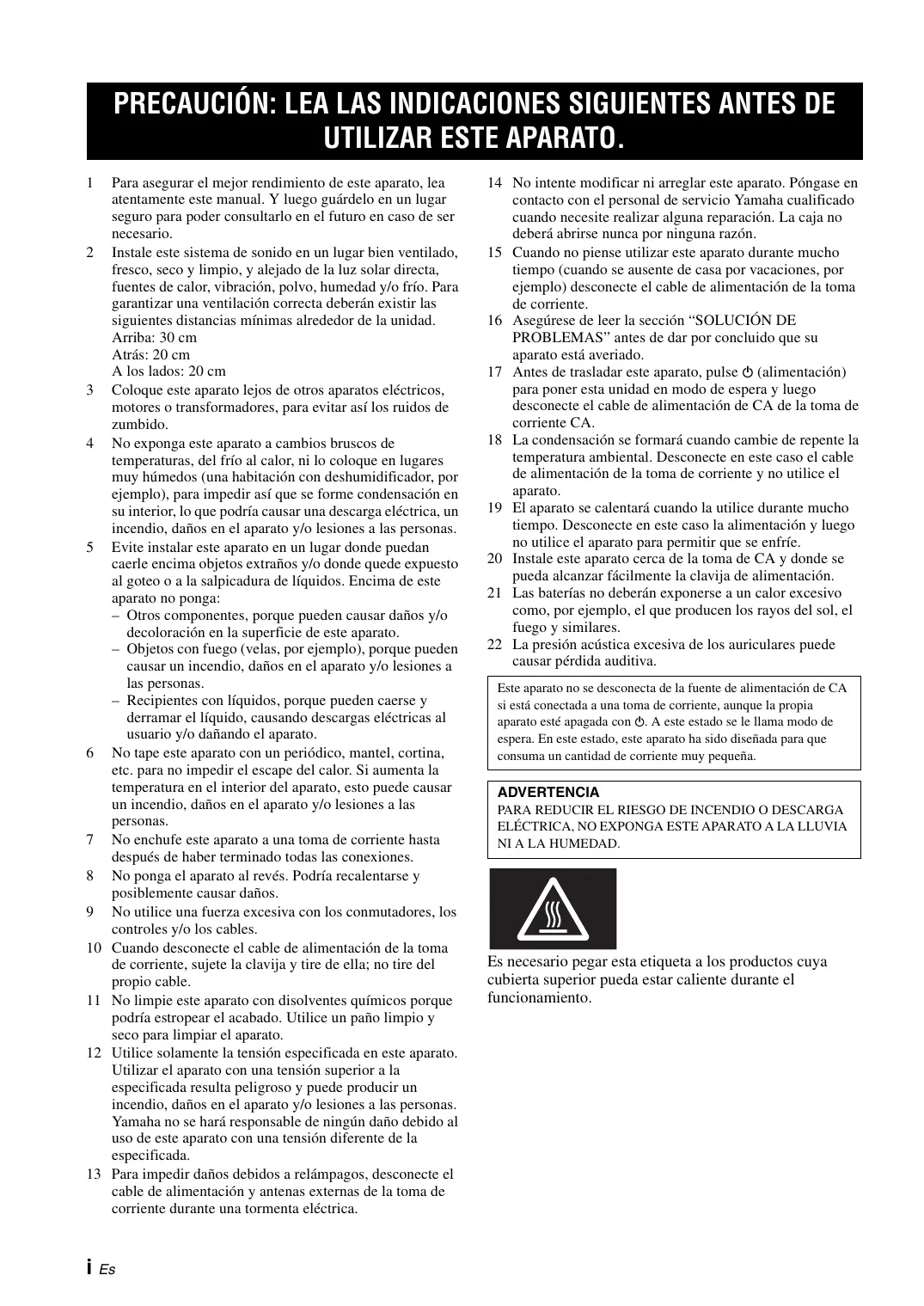 14 No intente modificar ni arreglar este aparato. Póngase en contacto con el personal de servicio Yamaha cualificado cuando necesite realizar alguna reparación. La caja no deberá abrirse nunca por ninguna razón.