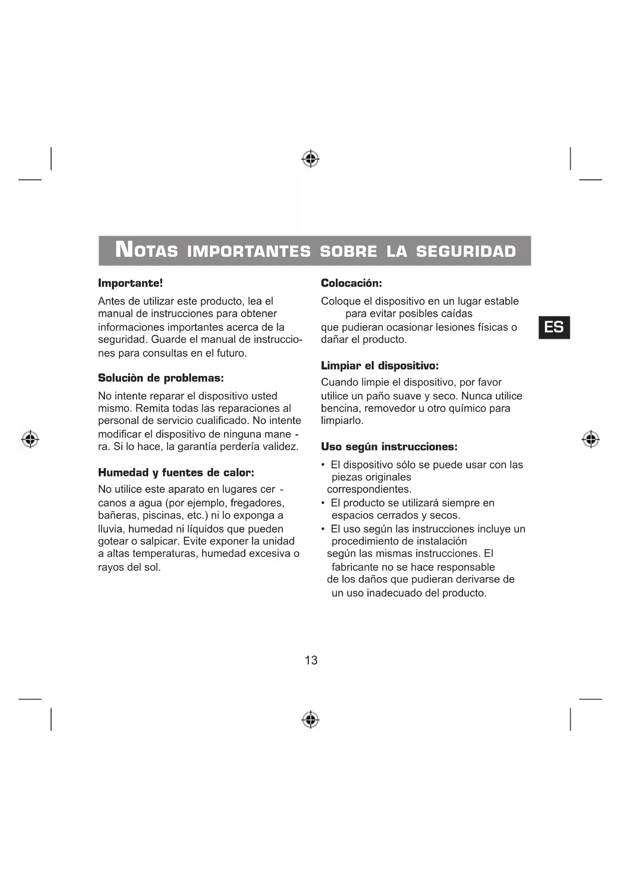 Importante! Antes de utilizar este producto, lea el manual de instrucciones para obtener informaciones importantes acerca de la seguridad. Guarde el manual de instruccio- nes para consultas en el futuro. Soluciòn de problemas: No intente reparar el dispositivo usted mismo. Remita todas las reparaciones al personal de servicio cualificado. No intente modificar el dispositivo de ninguna mane