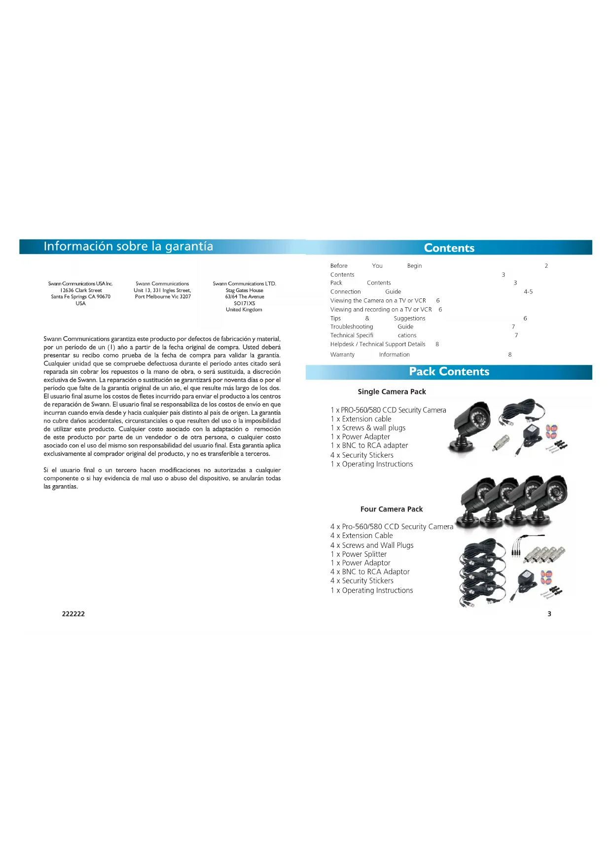 Especificaciones Técnicas202020Antes de hacer una instalación permanente, conecte la cámara a su televisión o VCR usando la Guía de Inicio Rápido para asegurarse que todos los componentes en el paquete estén funcionando correctamente. Si tiene problemas conectando el producto contacte a nuestro equipo de Soporte Técnico. Los detalles de contacto están en la página de la cubierta posterior de esta guía. Instale las cámaras sufi cientemente alto para que estén fuera de alcance para evi-tar alteraciones.Coloque las Calcomanías de Seguridad en una ubicación visible para alertar a po-tenciales ladrones de que están siendo monitoreados. Compre un DVR Swann para grabar múltiples cámaras simultáneamente y moni-torear fácilmente su propiedad. Coloque las cámaras en áreas de alto tránsito tales como puertas para maximizar la seguridad. Use solo el Suministro de Corriente incluido y no modifi que o corte alambres. 20 Viendo la PRO-560/580 en una TVDespués de conectar la Cámara PRO-560/580 directamente a su televisión y co-nectándola a la corriente como se describe en la página 4, sintonice la televisión al canal de entrada correcto.En el control remoto de su televisión, el botón de entrada usualmente se nombra como Input, Source, A/V, Channel 0, AUX, etc.*Viendo y Grabando la PRO-560/580 en una VCRConecte la PRO-560/580 a un canal de entrada disponible en su VCR de la misma forma como la conexión a televisión en la página 4. Encienda su VCR y televisión como si fuera a reproducir una cinta de video. En el control remoto de su VCR, busque el botón de entrada que usualmente se llama L1, L2, Input, Source, A/V, Channel 0, AUX, etc.* Inserte una cinta y pre-sione grabar para grabar la cámara. *Consulte el manual de instrucciones de la televisión o VCR para detalles sobre cómo cambiar canales de entrada.