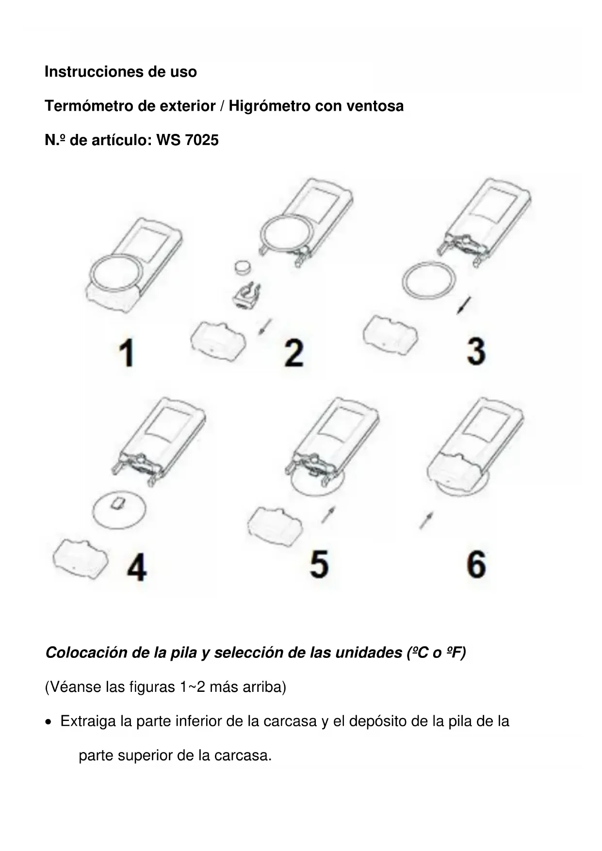 Colocación de la pila y selección de las unidades (ºC o ºF) (Véanse las figuras 1~2 más arriba) Extraiga la parte inferior de la carcasa y el depósito de la pila de la parte superior de la carcasa. Introduzca la pila teniendo en cuenta la posición correcta de los polos. Coloque el selector en grados Fahrenheit o Celsius. Vuelva a acoplar las partes superior e inferior de la carcasa. Cambiar de la vista exterior a la vista interior (Véanse las figuras 3~6 más arriba) El termómetro está unido a la ventosa para la vista exterior. Para cambiar a la vista interior, haga lo siguiente: Separe la parte inferior de la carcasa de la parte superior. Extraiga la ventosa de la parte superior de la carcasa. Gire 180 grados la parte inferior de la carcasa y la ventosa. Mueva la ventosa de nuevo a su sitio. Vuelva a unir las partes superior e inferior de la carcasa. Instalación del termómetro El termómetro puede fijarse en ventanas, espejos y superficies similares, planas y limpias. La ventosa no se mantiene fija ni en la madera ni sobre la suciedad. Limpie la superficie de grasa y demás residuos. Para colocar el termómetro, presione la ventosa con firmeza contra la superficie elegida. Asegúrese de que la ventosa se mantiene fija a lasuperficie. Datos técnicos: Rango de temperaturas: entre -4 °F y 140 °F (-20 °C y 60 °C) Tolerancia a la temperatura: +/-1,8 °F (+/-1,0 °C) Posibilidad de elegir entre ºC y ºF Rango del higrómetro: entre el 20% y el 95% Tolerancia del higrómetro: +/-5% del 30% al 90% ; +/-7% del 20% al 29% y 91% al 95% Requiere (1) pila LR44 o AG13 de botón Precauciones Esta unidad está diseñada para usarla solamente en interiores. No someta unidad a fuerzas o golpes excesivos. No exponga la unidad a temperaturas extremas, directa a los rayos del sol, polvo o humedad. No la sumerja en el agua. Evite el contacto con cualquier material corrosivo. No se deshaga de esta unidad arrojándola al fuego ya que puede explotar. No abra la carcasa trasera interior ni manipule ninguno de los componentes de esta unidad. Advertencias de seguridad sobre las baterías Utilizar solamente baterías alcalinas. No utilizar recargables baterías. Coloque las baterías correctamente haciendo coincidir la polaridad (+/-). Reemplace siempre el juego completo de baterías. Nunca mezcle baterías usadas y nuevas. Quite las baterías gastadas inmediatamente. Saque las baterías cuando no use la unidad. No recargue las baterías ni las arroje al fuego ya que pueden reventar. Compruebe que guarda las baterías alejadas de objetos metálicos ya que un contacto con estos puede causar un cortocircuito. Evite exponer las baterías a altas temperaturas, humedad o a los rayos directos del sol. Guarde las baterías lejos del alcance de los niños. Pueden atragantarse con ellas. Utilice el producto sólo para la finalidad expuesta! Obligación en virtud de la ley de baterías Las baterías usadas no deben ser eliminadas en la basura doméstica. Si las baterías llegan al medio ambiente, éstas pueden ocasionar graves efectos para la salud o para el proprio medio ambiente. Puede devolver las baterías usadas de forma gratuita a su distribuidor o suministrador. Según la ley, como consumidor uste destá obligado a devolver las baterías usadas! Obligación en virtud de la ley de los dispositivos eléctricos Este símbolo indica que no debe arrojar los dispositivos eléctricos a la basura doméstica general cuando alcancen el final de su vida a útil. Lleve su aparato a un punto de recogida selectiva de basura o a un centro de reciclaje. Esto es de aplicación en todos los países de la Unión Europea, y en otros países europeos con sistemas de recogida selectiva de basuras.Handleiding Vensterthermometer / hygrometer met zuignap Art. Nr.: WS 7025