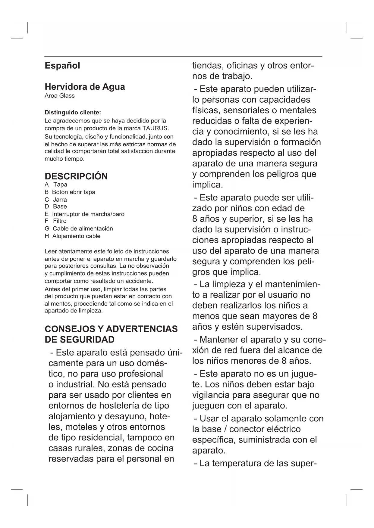 GHFig.1 Fig.2 Fig.3 Fig.4 Fig.5 Fig.6Fig.10 Fig.11 Fig.9 Fig.8 Fig.7Español Hervidora de Agua Aroa Glass Distinguido cliente: Le agradecemos que se haya decidido por la compra de un producto de la marca TAURUS. Su tecnología, diseño y funcionalidad, junto con el hecho de superar las más estrictas normas de calidad le comportarán total satisfacción durante mucho tiempo. DESCRIPCIÓN A Tapa B Botón abrir tapa C Jarra D Base E Interruptor de marcha/paro F Filtro G Cable de alimentación H Alojamiento cable Leer atentamente este folleto de instrucciones antes de poner el aparato en marcha y guardarlo para posteriores consultas. La no observación y cumplimiento de estas instrucciones pueden comportar como resultado un accidente. Antes del primer uso, limpiar todas las partes del producto que puedan estar en contacto con alimentos, procediendo tal como se indica en el apartado de limpieza.