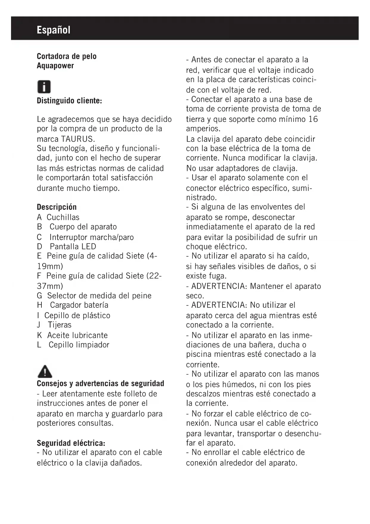 Aquapower - Recortador de barba TAURUS - Manual de uso y guía de instrucciones gratis