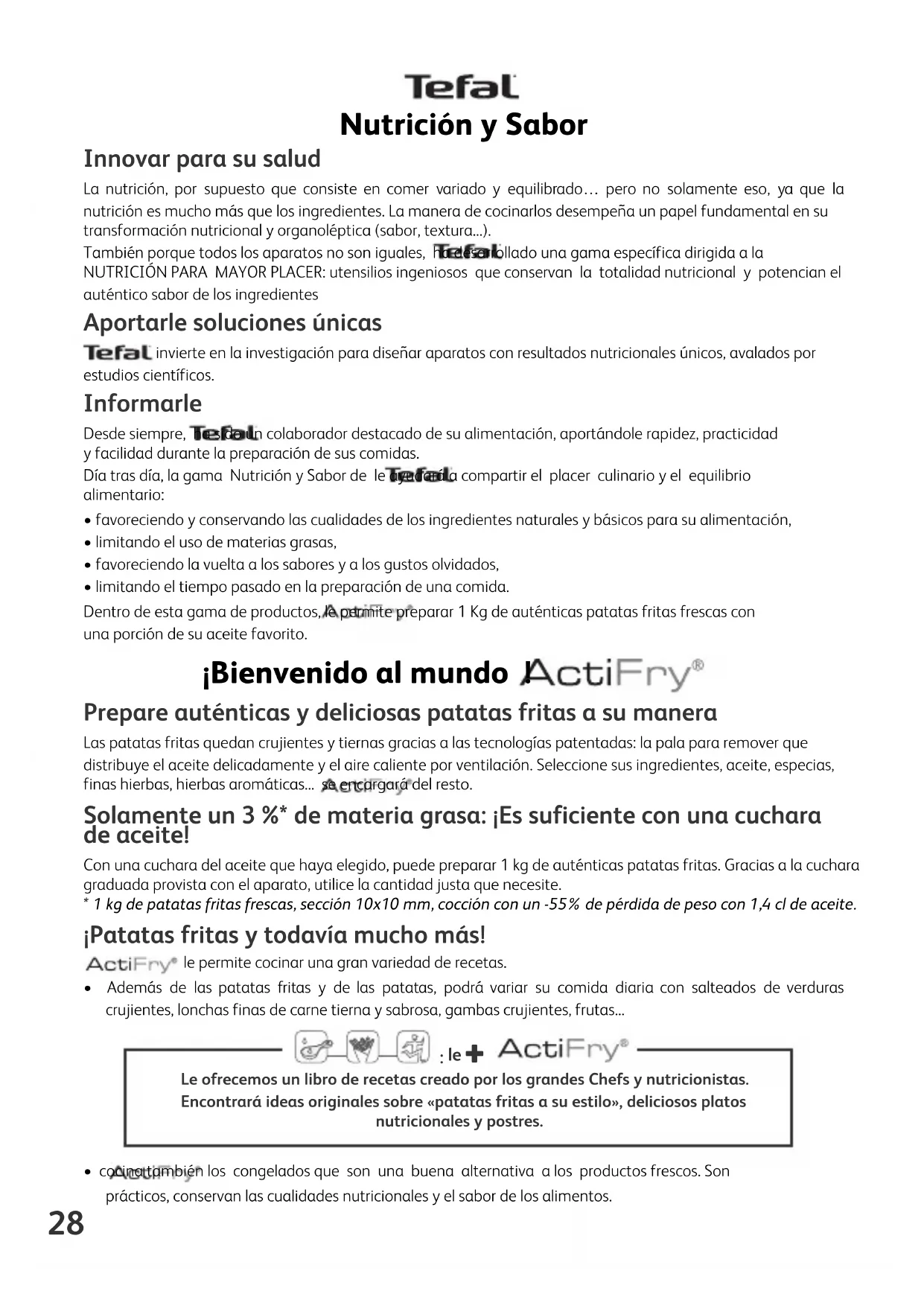 La nutrición, por supuesto que consiste en comer variado y equilibrado… pero no solamente eso, ya que la nutrición es mucho más que los ingredientes. La manera de cocinarlos desempeña un papel fundamental en sutransformación nutricional y organoléptica (sabor, textura...).También porque todos los aparatos no son iguales, ha desarrollado una gama específica dirigida a laNUTRICIÓN PARA MAYOR PLACER: utensilios ingeniosos que conservan la totalidad nutricional y potencian elauténtico sabor de los ingredientes Aportarle soluciones únicas invierte en la investigación para diseñar aparatos con resultados nutricionales únicos, avalados porestudios científicos. Informarle Desde siempre, ha sido un colaborador destacado de su alimentación, aportándole rapidez, practicidady facilidad durante la preparación de sus comidas.Día tras día, la gama Nutrición y Sabor de le ayudará a compartir el placer culinario y el equilibrioalimentario:• favoreciendo y conservando las cualidades de los ingredientes naturales y básicos para su alimentación,• limitando el uso de materias grasas,• favoreciendo la vuelta a los sabores y a los gustos olvidados,• limitando el tiempo pasado en la preparación de una comida.Dentro de esta gama de productos, le permite preparar 1 Kg de auténticas patatas fritas frescas conuna porción de su aceite favorito. ¡Bienvenido al mundo !