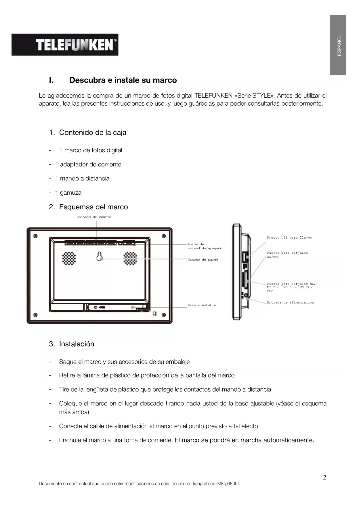 Le agradecemos la compra de un marco de fotos digital TELEFUNKEN «Serie STYLE». Antes de utilizar el aparato, lea las presentes instrucciones de uso, y luego guárdelas para poder consultarlas posteriormente.