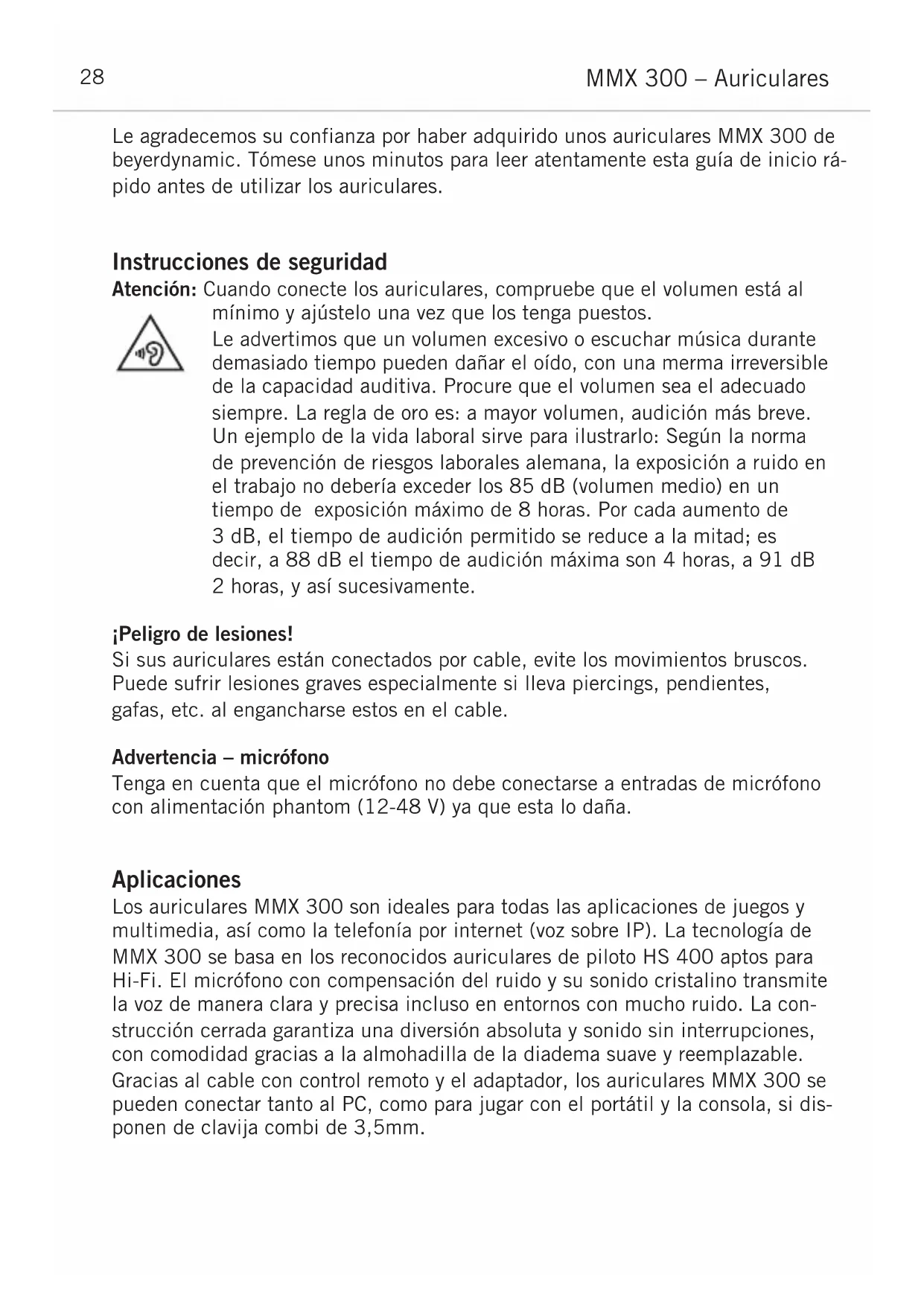 Le agradecemos su confianza por haber adquirido unos auriculares MMX 300 de beyerdynamic. Tómese unos minutos para leer atentamente esta guía de inicio rá- pido antes de utilizar los auriculares. Instrucciones de seguridad Atención: Cuando conecte los auriculares, compruebe que el volumen está al mínimo y ajústelo una vez que los tenga puestos. Le advertimos que un volumen excesivo o escuchar música durante demasiado tiempo pueden dañar el oído, con una merma irreversible de la capacidad auditiva. Procure que el volumen sea el adecuado siempre. La regla de oro es: a mayor volumen, audición más breve. Un ejemplo de la vida laboral sirve para ilustrarlo: Según la norma de prevención de riesgos laborales alemana, la exposición a ruido en el trabajo no debería exceder los 85 dB (volumen medio) en un tiempo de exposición máximo de 8 horas. Por cada aumento de 3 dB, el tiempo de audición permitido se reduce a la mitad; es decir, a 88 dB el tiempo de audición máxima son 4 horas, a 91 dB 2 horas, y así sucesivamente. ¡Peligro de lesiones! Si sus auriculares están conectados por cable, evite los movimientos bruscos. Puede sufrir lesiones graves especialmente si lleva piercings, pendientes, gafas, etc. al engancharse estos en el cable. Advertencia – micrófono Tenga en cuenta que el micrófono no debe conectarse a entradas de micrófono con alimentación phantom (12-48 V) ya que esta lo daña. Aplicaciones Los auriculares MMX 300 son ideales para todas las aplicaciones de juegos y multimedia, así como la telefonía por internet (voz sobre IP). La tecnología de MMX 300 se basa en los reconocidos auriculares de piloto HS 400 aptos para Hi-Fi. El micrófono con compensación del ruido y su sonido cristalino transmite la voz de manera clara y precisa incluso en entornos con mucho ruido. La con- strucción cerrada garantiza una diversión absoluta y sonido sin interrupciones, con comodidad gracias a la almohadilla de la diadema suave y reemplazable. Gracias al cable con control remoto y el adaptador, los auriculares MMX 300 se pueden conectar tanto al PC, como para jugar con el portátil y la consola, si dis- ponen de clavija combi de 3,5mm.español MMX 300 – Auriculares