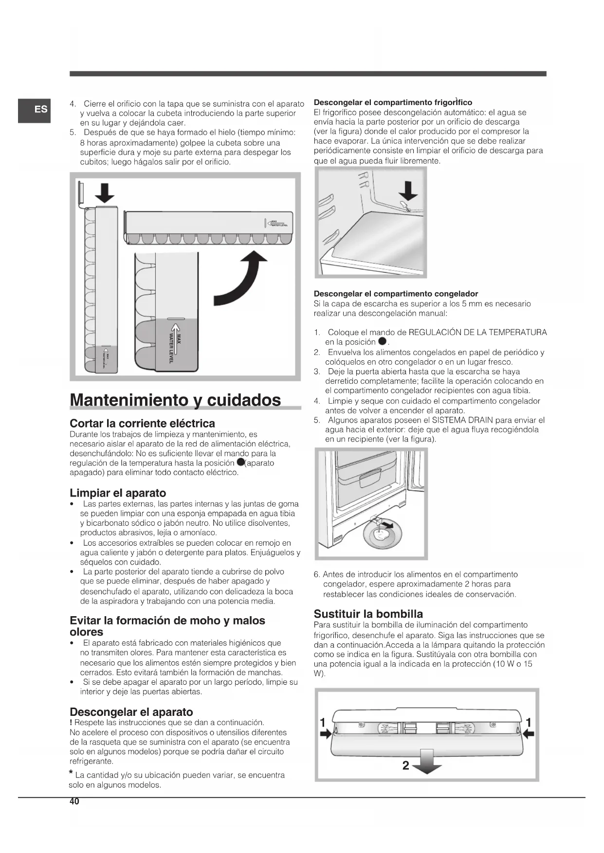 olores • Elaparatoestáfabricadoconmaterialeshigiénicosquenotransmitenolores.Paramantenerestacaracterísticaesnecesarioquelosalimentosesténsiempreprotegidosybiencerrados.Estoevitarátambiénlaformacióndemanchas.• Sisedebeapagarelaparatoporunlargoperíodo,limpiesuinteriorydejelaspuertasabiertas. Descongelar el aparato !Respetelasinstruccionesquesedanacontinuación.Noacelereelprocesocondispositivosoutensiliosdiferentesdelarasquetaquesesuministraconelaparato(seencuentrasoloenalgunosmodelos)porquesepodríadañarelcircuitorefrigerante.Descongelar el compartimento frigorÌficoElfrigoríficoposeedescongelaciónautomático:elaguaseenvíahacialaparteposteriorporunorificiodedescarga(verlafigura)dondeelcalorproducidoporelcompresorlahaceevaporar.Laúnicaintervenciónquesedeberealizarperiódicamenteconsisteenlimpiarelorificiodedescargaparaqueelaguapuedafluirlibremente.Descongelar el compartimento congeladorSilacapadeescarchaessuperioralos5mmesnecesariorealizarunadescongelaciónmanual:1. ColoqueelmandodeREGULACIÓNDELATEMPERATURAenlaposición . 2. Envuelvalosalimentoscongeladosenpapeldeperiódicoycolóquelosenotrocongeladoroenunlugarfresco.3. Dejelapuertaabiertahastaquelaescarchasehayaderretidocompletamente;facilitelaoperacióncolocandoenelcompartimentocongeladorrecipientesconaguatibia.4. Limpieysequeconcuidadoelcompartimentocongeladorantesdevolveraencenderelaparato.5. AlgunosaparatosposeenelSISTEMADRAINparaenviarelaguahaciaelexterior:dejequeelaguafluyarecogiéndolaenunrecipiente(verlafigura).6.Antesdeintroducirlosalimentosenelcompartimentocongelador,espereaproximadamente2horaspararestablecerlascondicionesidealesdeconservación. Sustituir la bombilla Parasustituirlabombilladeiluminacióndelcompartimentofrigorífico,desenchufeelaparato.Sigalasinstruccionesquesedanacontinuación.Accedaalalámparaquitandolaproteccióncomoseindicaenlafigura.Sustitúyalaconotrabombillaconunapotenciaigualalaindicadaenlaprotección(10Wo15 W).