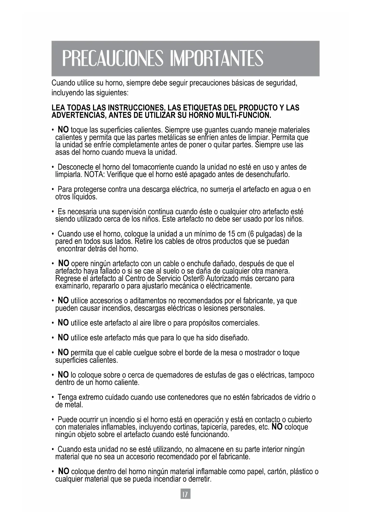 LEA TODAS LAS INSTRUCCIONES, LAS ETIQUETAS DEL PRODUCTO Y LAS ADVERTENCIAS, ANTES DE UTILIZAR SU HORNO MULTI-FUNCION.