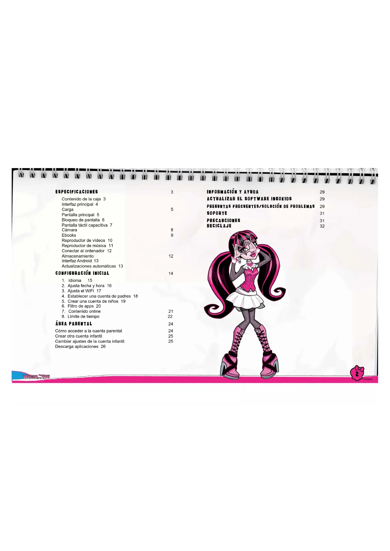 ©Mael Pantalla tactil capacitiva La tableta Monster High tiene una pantalla capacitiva multi táctil. Sólo necesitas tus dedos para controlarla. Toca la pantalla para abrir aplicaciones, vi- deos y archivos. ? Desliza los dedos arriba y abajo para desplazarte y desplaza los dedos hacía la derecha e izquierda para navegar por los menús. ? Usa dos dedos para hacer zoom cuando mires fotos, páginas web y otros documentos. Nota: La respuesta de la pantalla táctil capacitiva varía en función de la persona, esto es debido a la naturaleza de la tecnología usada ©Mael Camara La tableta Monster High tiene 2 cámaras digitales para tomar fotos y hacer videos, una frontal para hacer fotos de ti y usarla para videollamadas y otra en la parte posterior para hacer fotos de tu familia y amigos.
