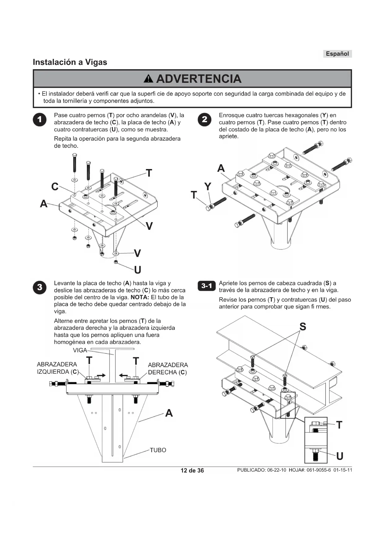 L12 de 36 PUBLICADO: 06-22-10 HOJA#: 061-9055-6 01-15-11 Español Pase cuatro pernos (T) por ocho arandelas (V), la abrazadera de techo (C), la placa de techo (A) y cuatro contratuercas (U), como se muestra. Repita la operación para la segunda abrazadera de techo. Levante la placa de techo (A) hasta la viga y deslice las abrazaderas de techo (C) lo más cerca posible del centro de la viga. NOTA: El tubo de la placa de techo debe quedar centrado debajo de la viga. Alterne entre apretar los pernos (T) de la abrazadera derecha y la abrazadera izquierda hasta que los pernos apliquen una fuera homogénea en cada abrazadera. Enrosque cuatro tuercas hexagonales (Y) en cuatro pernos (T). Pase cuatro pernos (T) dentro del costado de la placa de techo (A), pero no los apriete. Apriete los pernos de cabeza cuadrada (S) a través de la abrazadera de techo y en la viga. Revise los pernos (T) y contratuercas (U) del paso anterior para comprobar que sigan fi rmes.