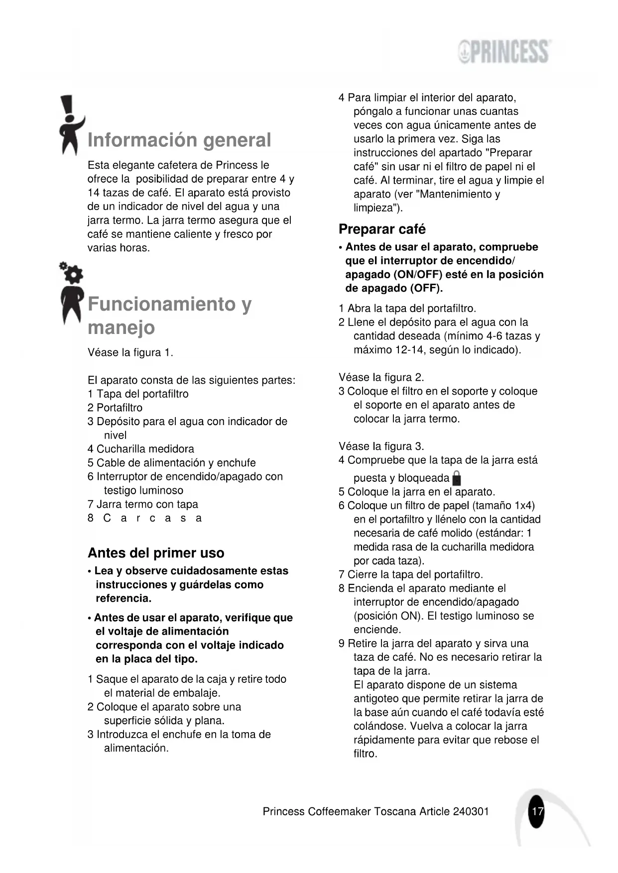 - 2002/96/EC17 Princess Coffeemaker Toscana Article 240301 Información general Esta elegante cafetera de Princess le ofrece la posibilidad de preparar entre 4 y 14 tazas de café. El aparato está provisto de un indicador de nivel del agua y una jarra termo. La jarra termo asegura que el café se mantiene caliente y fresco por varias horas. Funcionamiento y manejo Véase la figura 1. El aparato consta de las siguientes partes: 1 Tapa del portafiltro 2 Portafiltro 3 Depósito para el agua con indicador de nivel 4 Cucharilla medidora 5 Cable de alimentación y enchufe 6 Interruptor de encendido/apagado con testigo luminoso 7 Jarra termo con tapa 8Carcasa Antes del primer uso
