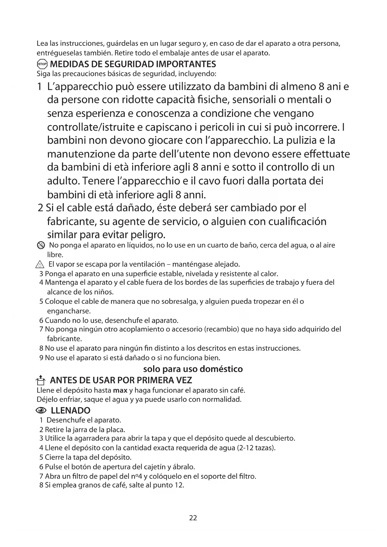 U ANTES DE USAR POR PRIMERA VEZ Llene el depósito hasta max y haga funcionar el aparato sin café.