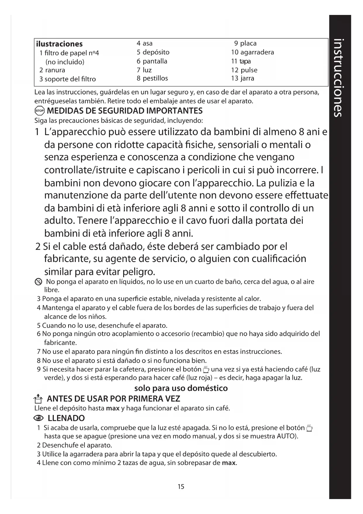 U ANTES DE USAR POR PRIMERA VEZ Llene el depósito hasta max y haga funcionar el aparato sin café.