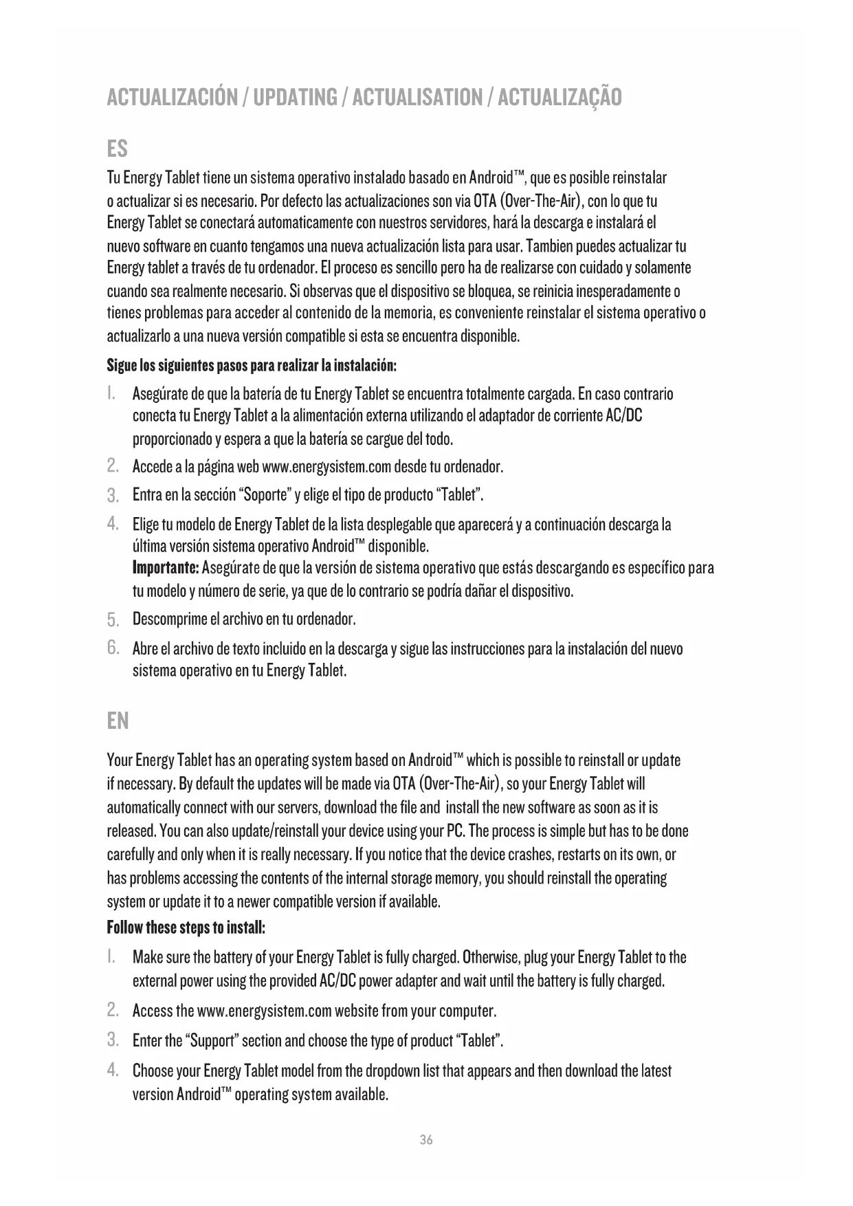 Tu Energy Tablet tiene un sistema operativo instalado basado en Android™, que es posible reinstalar o actualizar si es necesario. Por defecto las actualizaciones son via OTA (Over-The-Air), con lo que tu Energy Tablet se conectará automaticamente con nuestros servidores, hará la descarga e instalará el nuevo software en cuanto tengamos una nueva actualización lista para usar. Tambien puedes actualizar tu Energy tablet a través de tu ordenador. El proceso es sencillo pero ha de realizarse con cuidado y solamente cuando sea realmente necesario. Si observas que el dispositivo se bloquea, se reinicia inesperadamente o tienes problemas para acceder al contenido de la memoria, es conveniente reinstalar el sistema operativo o actualizarlo a una nueva versión compatible si esta se encuentra disponible. Sigue los siguientes pasos para realizar la instalación: