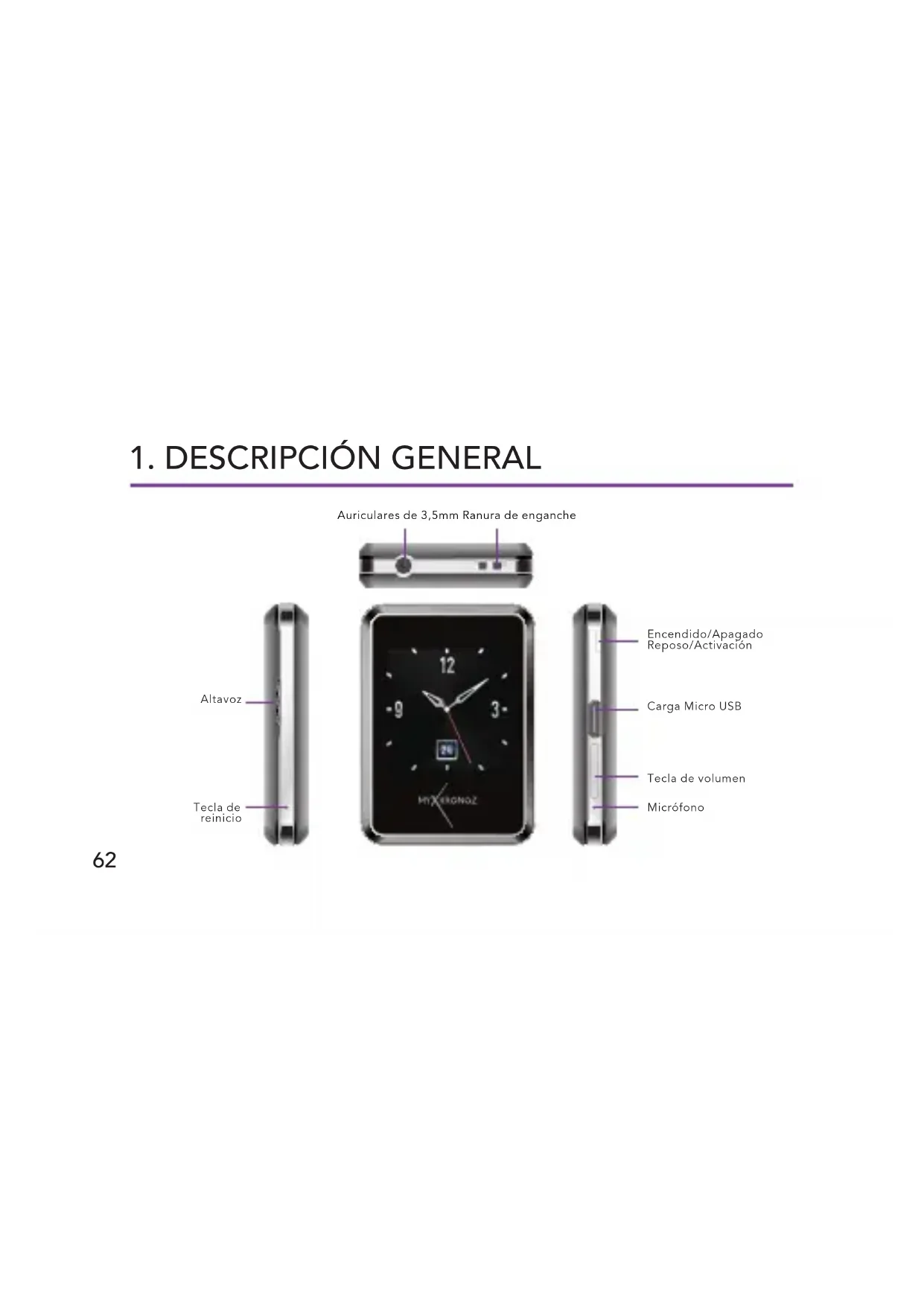 Auriculares de 3,5mm Ranura de enganche Encendido/Apagado Reposo/Activación Carga Micro USB Tecla de volumen Micrófono Altavoz Tecla de reinicio63 Icono Denición Indicador de batería Nuevo mensaje La alarma está encendida Vibrar Bluetooth Auriculares64